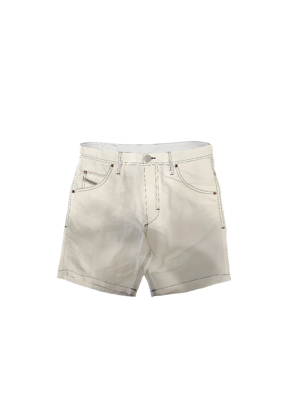 Costume 5 tasche in nylon ad asciugatura rapida tinta unita panna ,con impunture blu. Taglio bermuda e retina interna removibile lo rendono ideale anche come bermuda