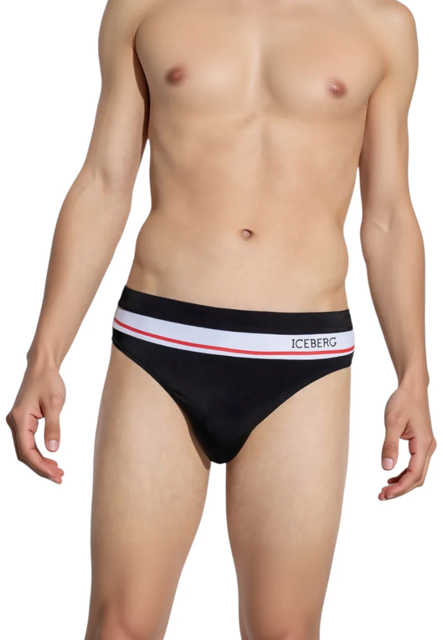 Costume slip in tre colori con fascia a contrasto bianca a rossa e logo laterale. 80% poliammide 20% elastan