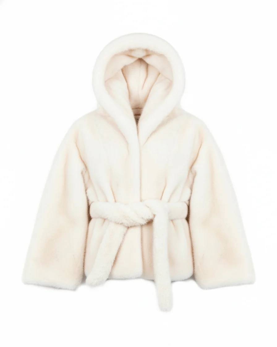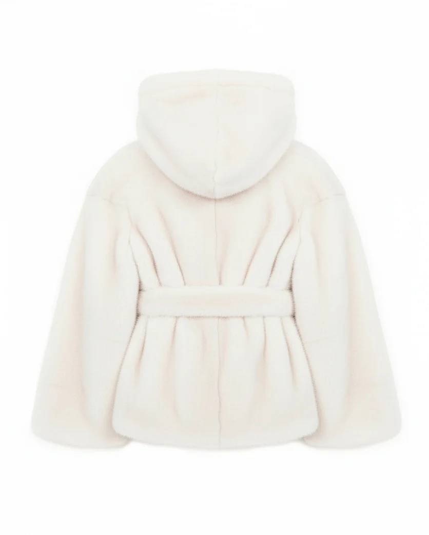 Ecovisone per ragazza con cappuccio e cintura in vita.Taglio corto
