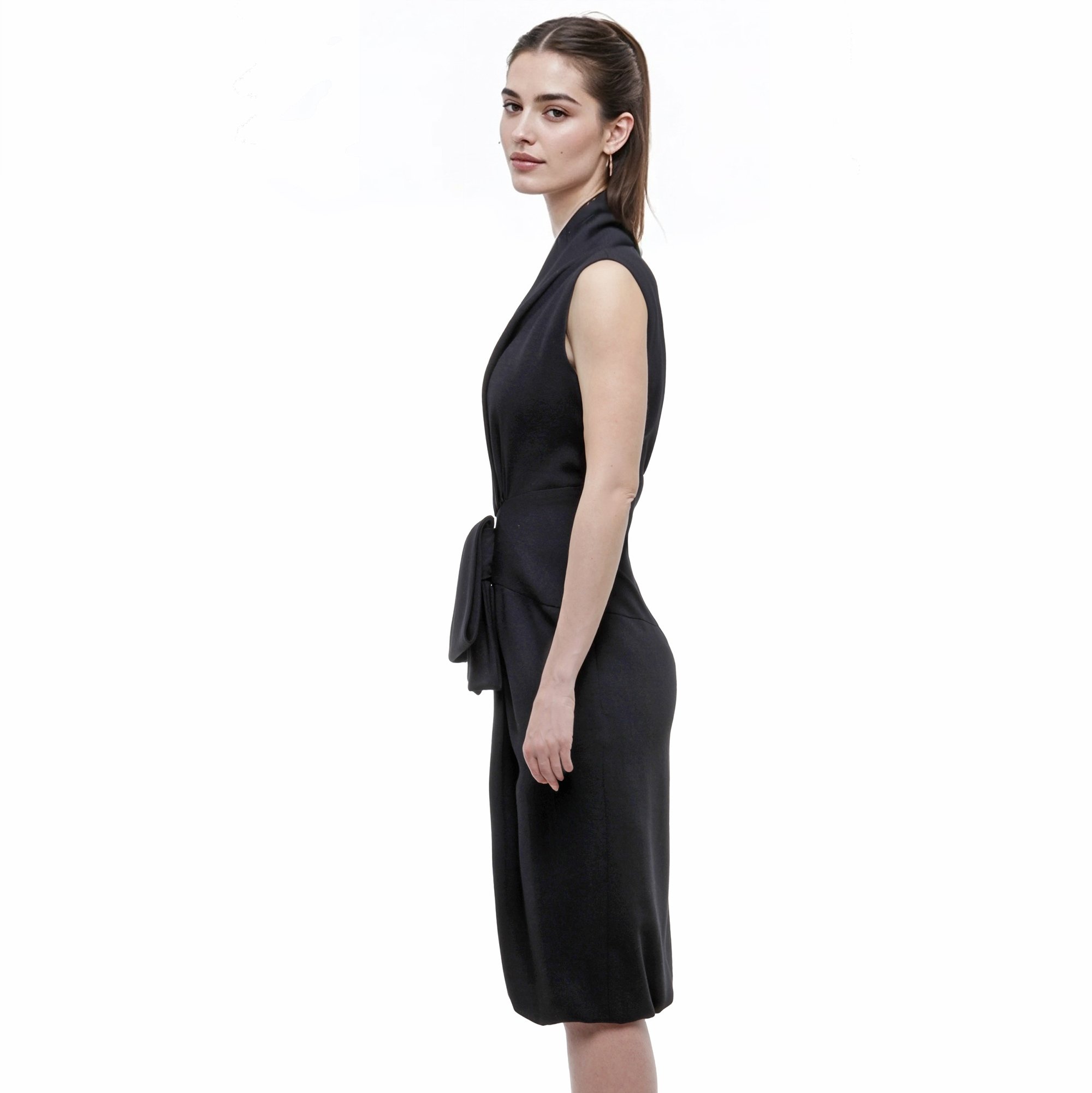 Eleva il tuo stile con questo abito elegante da donna firmato Emanuel Ungaro, realizzato in 100% lana con fodera in seta per un comfort impeccabile e una vestibilità di lusso. Il design sofisticato presenta una profonda scollatura frontale, un raffinato fiocco decorativo e un taglio senza maniche che valorizza la silhouette.