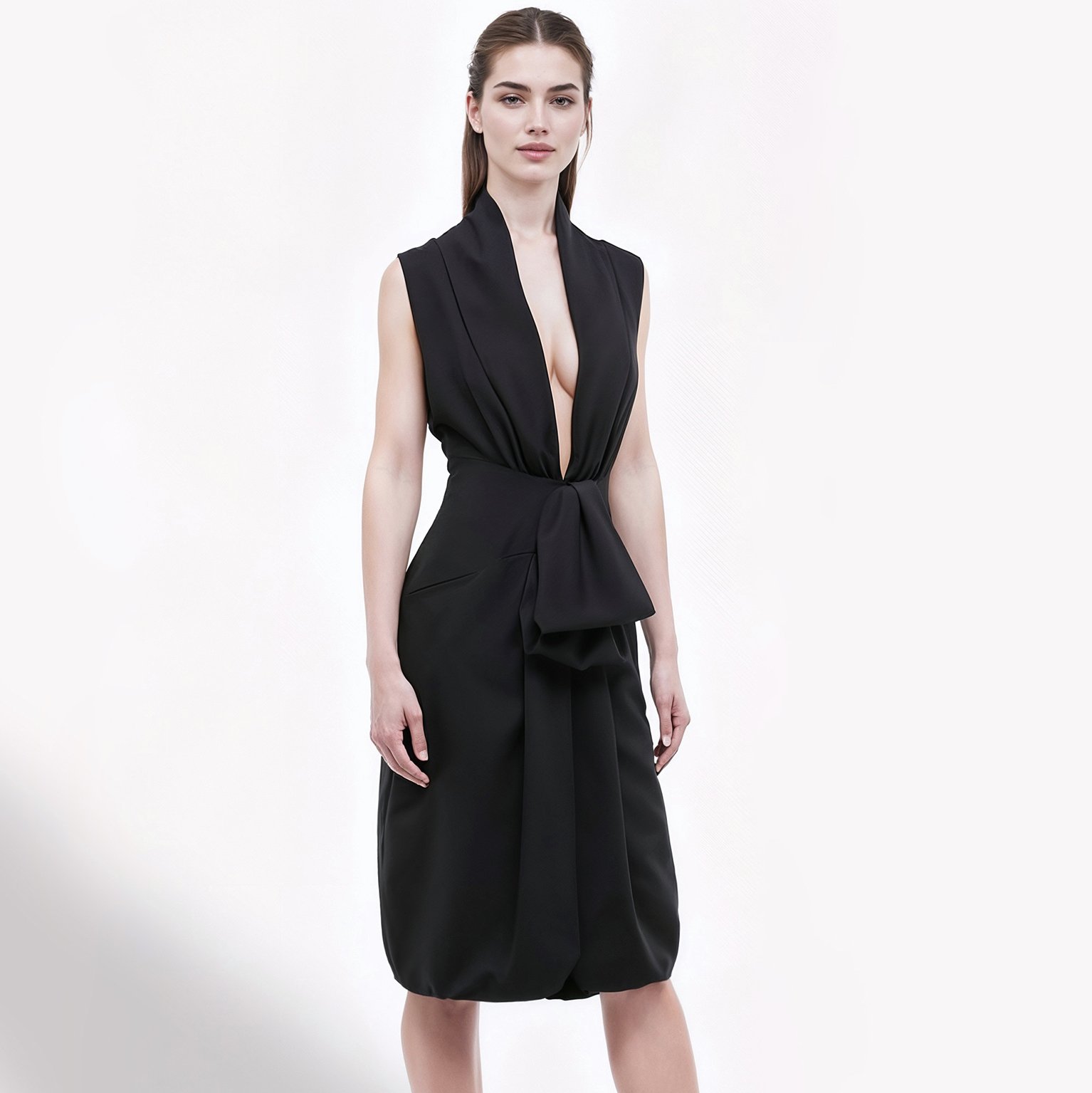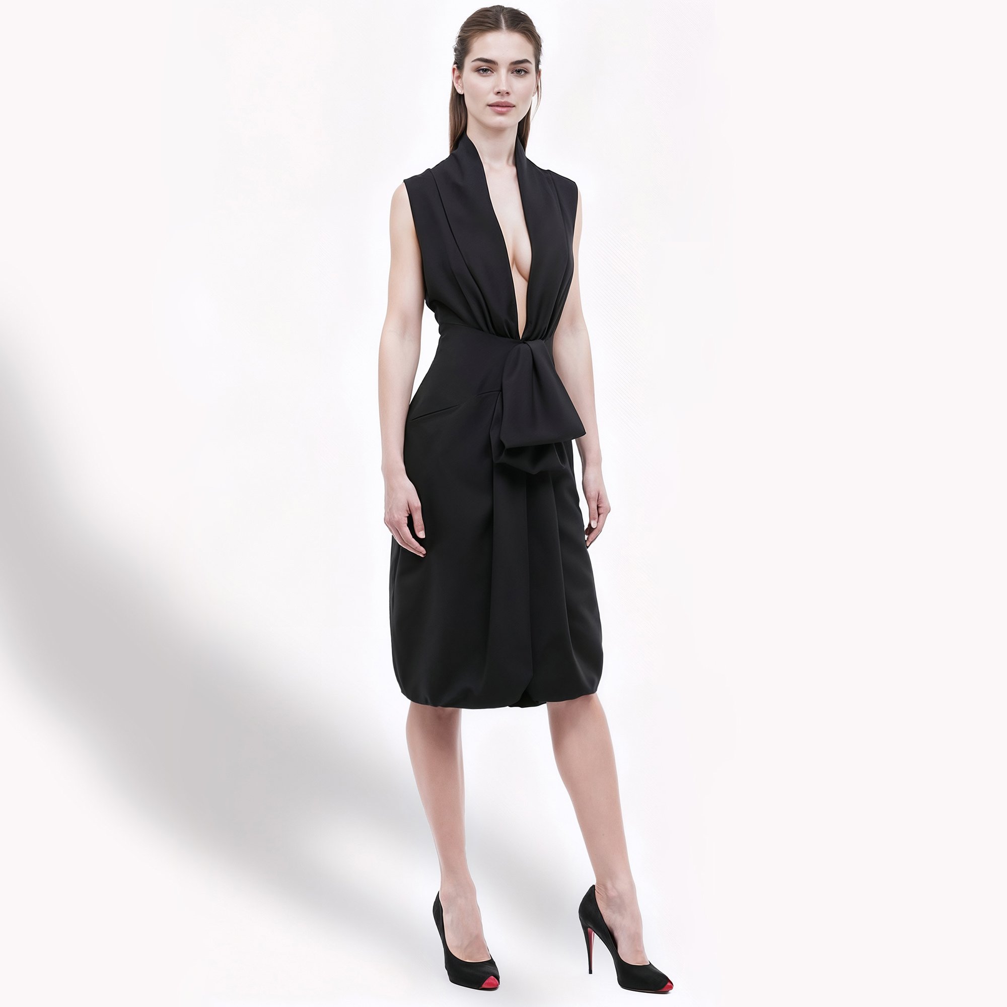 Abito elegante da donna Emanuel Ungaro in pura lana con fodera in seta, caratterizzato da profonda scollatura, fiocco frontale e fondo a palloncino. Un capo sofisticato per la sera e le occasioni speciali. Â