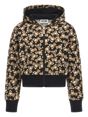 Felpa per bambina in cotone garzato con cappuccio e vestibilitร cropped; polsini ed elastico in vita in contrasto di colore nero. Chiusura con zip e stampa Teddy all over.