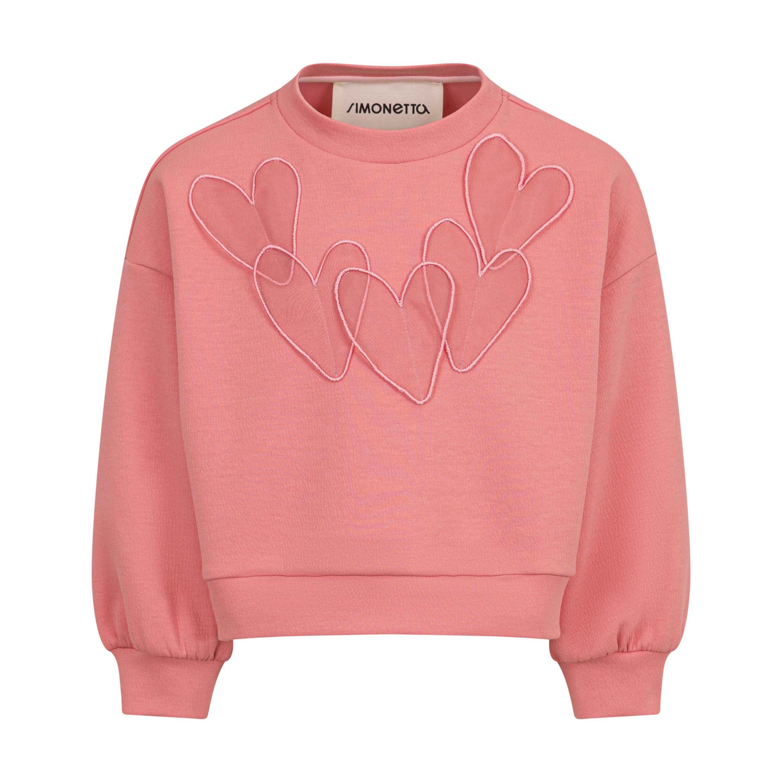 Felpa Simonetta per bambine color rosa con dettagli cuore in organza, girocollo, polsini e orlo con elastico.