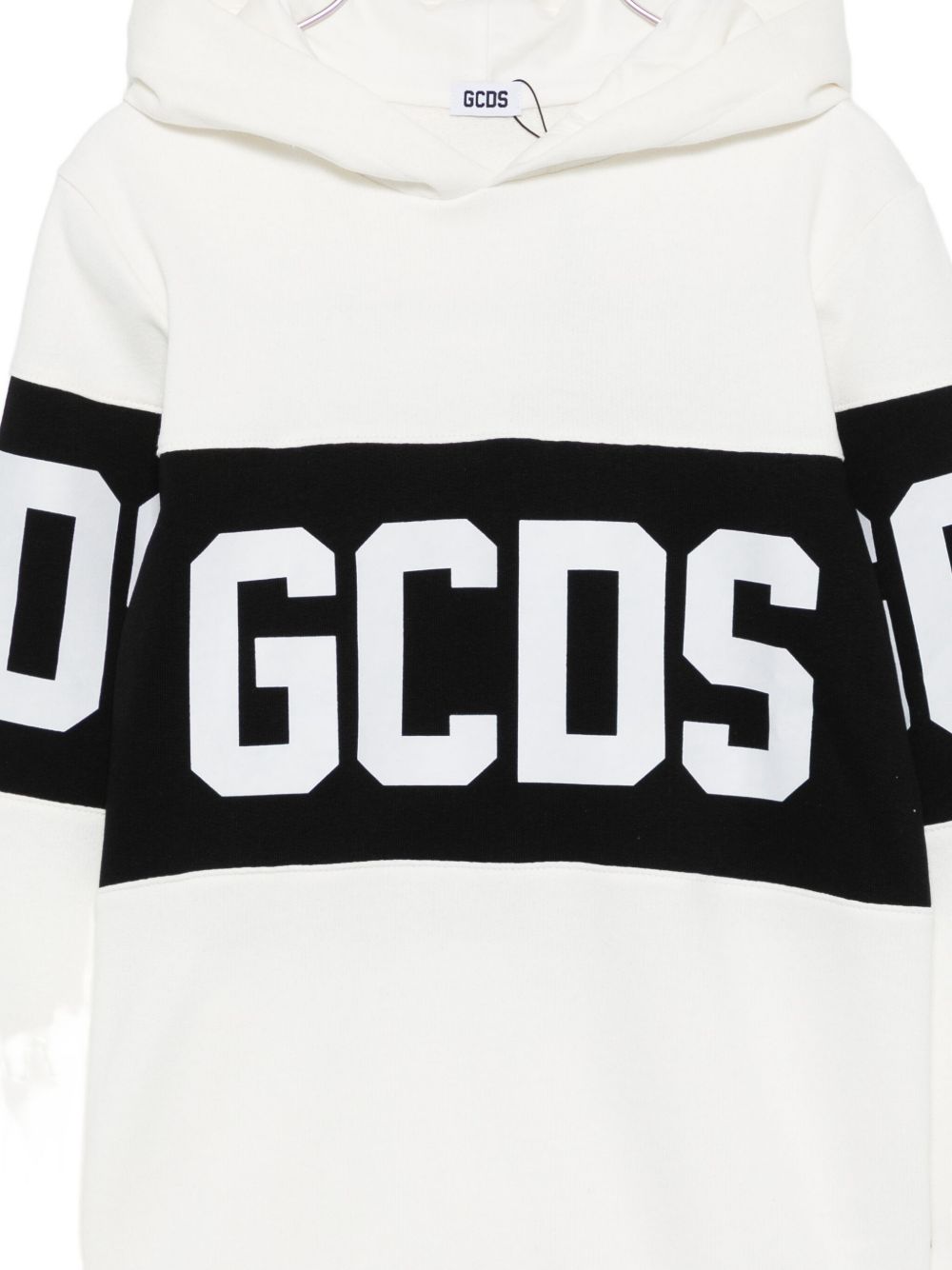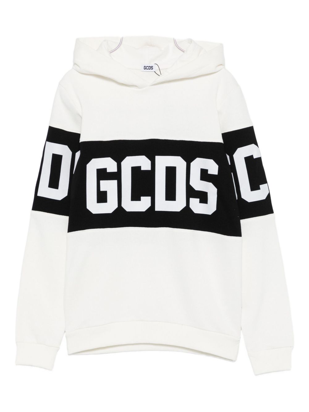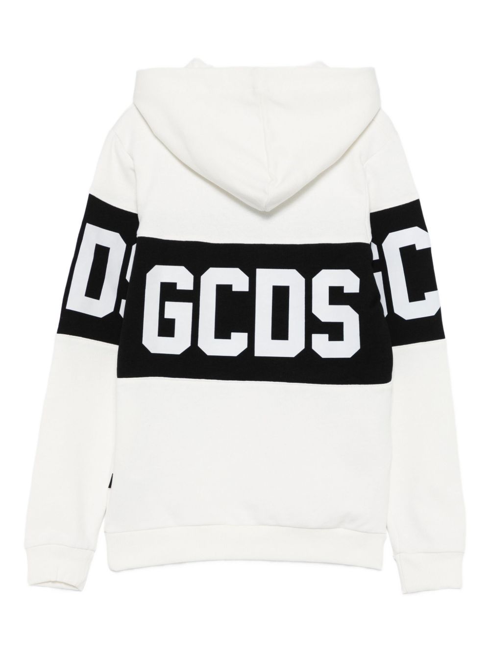 Felpa in caldo cotone con cappuccio fondo bianco e maxi logo GCDS fronte e retro.