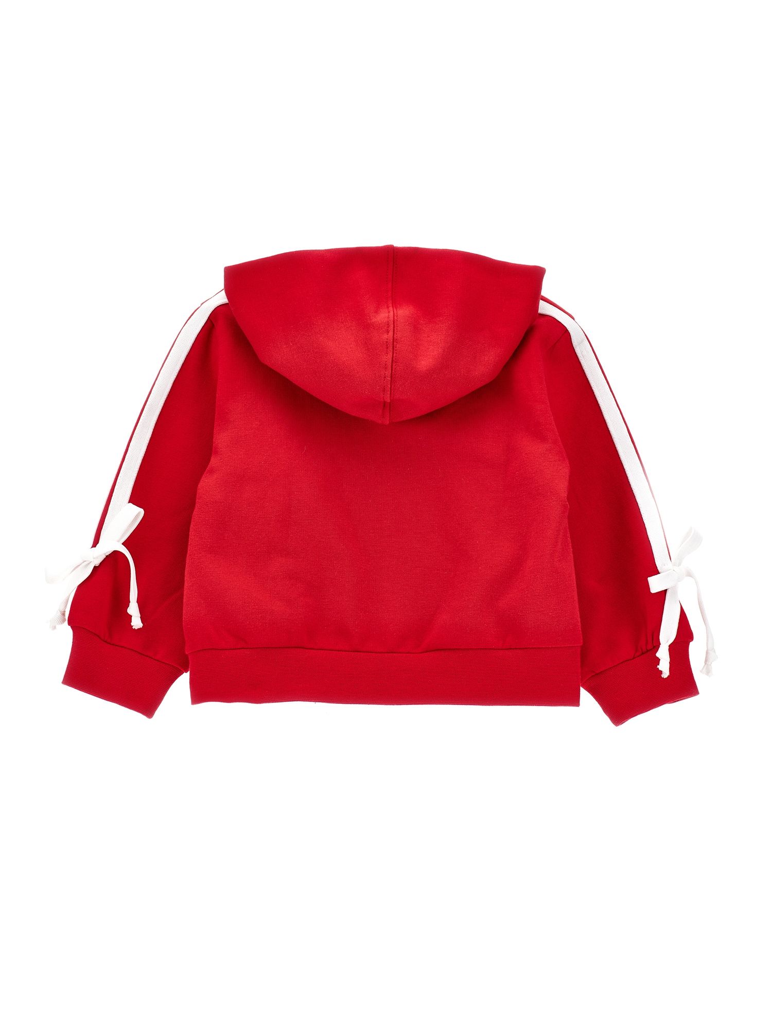 Felpa per neonata Monnalisa, realizzata in cotone 95%, elastan 5%. Il prodotto presenta un colore rosso, scollo con cappuccio, chiusura frontale con cerniera, decorazioni in strass, dettagli laterali con nastro, maniche lunghe.