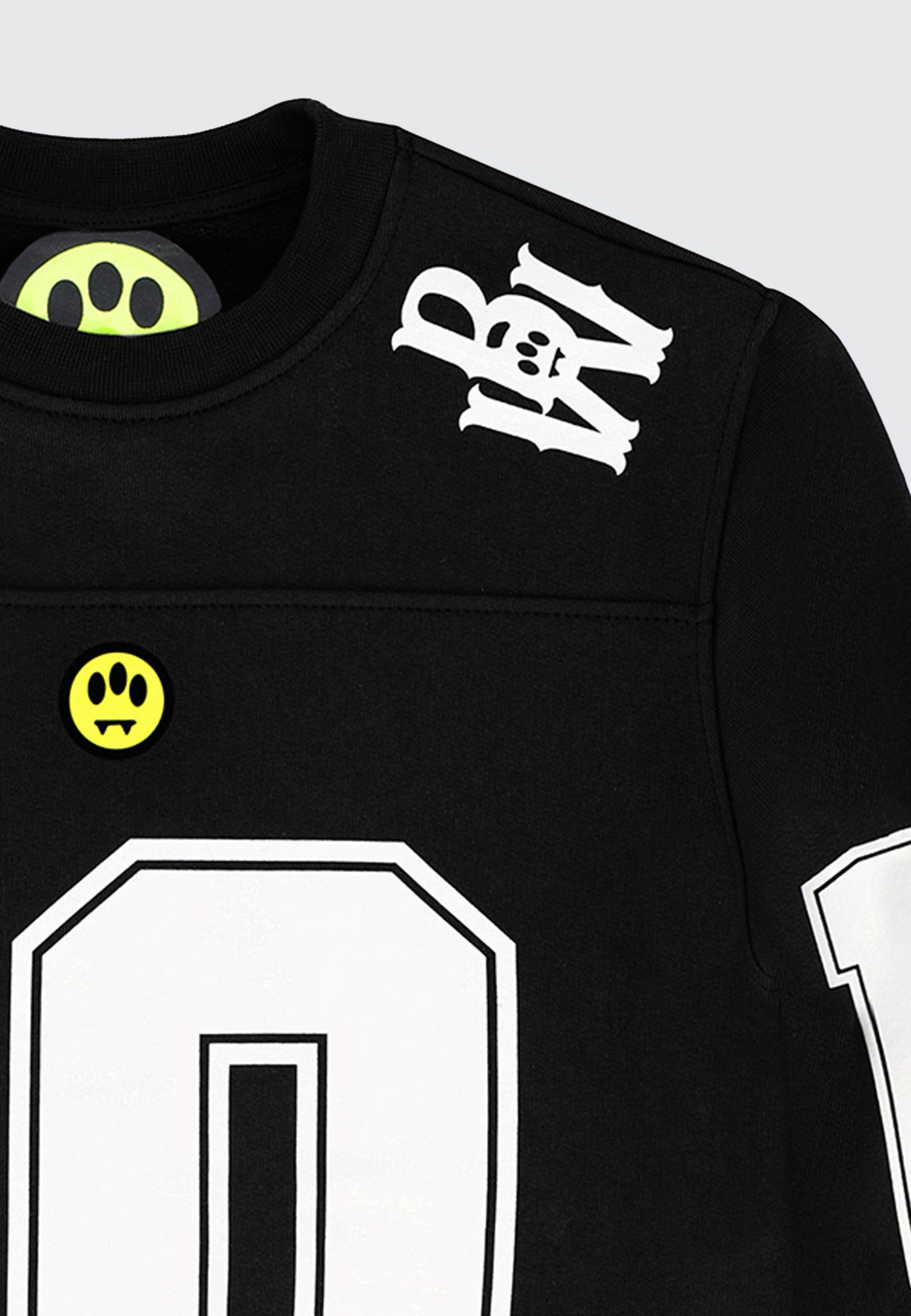 Felpa ragazzo di colore nero con polsini e orlo in costina elastica, cotone garzato e vestibilitร regolare; maxi stampa numeri in contrasto di colore bianco sia sulle maniche che sul retro, logo iconico in verde fluo sulla parte frontale.
