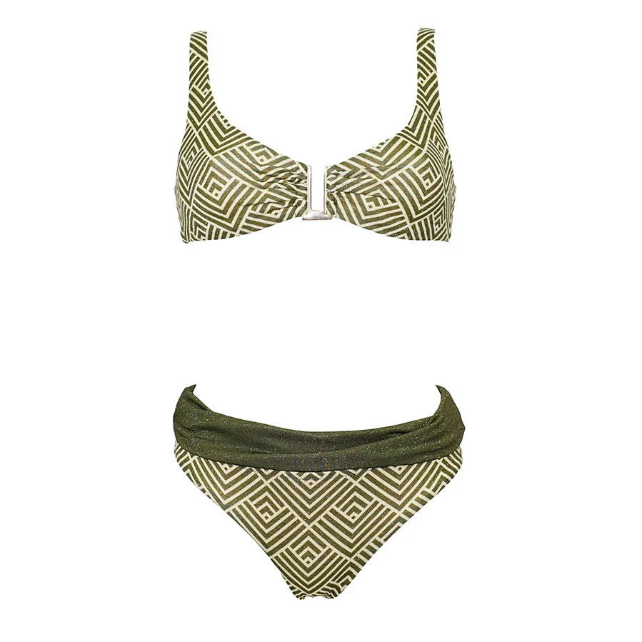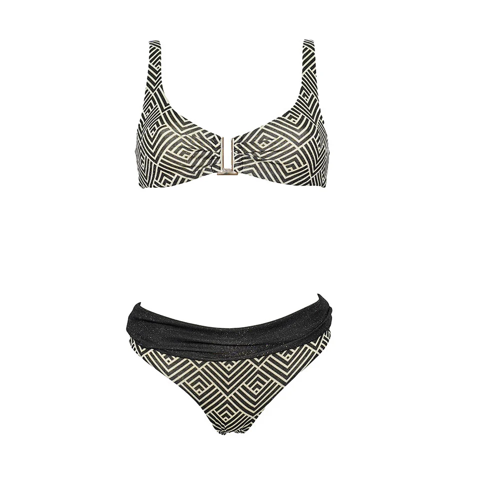 Questo bikini con ferretto contenitivo รจ pensato per valorizzare le forme con una struttura raffinata e studiata per offrire unโottima vestibilitร , soprattutto a chi ha un seno abbondante. Il ferretto sottoseno assicura sostegno e definizione, mentre le bretelle regolabili e la chiusura a gancio sul retro garantiscono il massimo comfort. Al centro, un accessorio dorato illumina il dรฉcolletรฉ con un tocco di raffinatezza. Lo slip, comodo e avvolgente, presenta un fascione in tinta unita per esaltare la silhouette e nascondere piccoli difetti, assicurando un look sofisticato e armonioso.