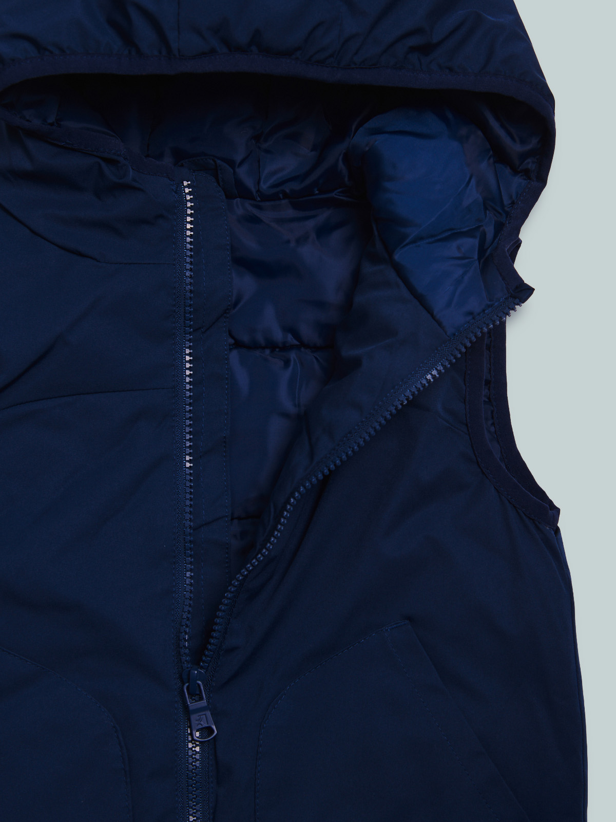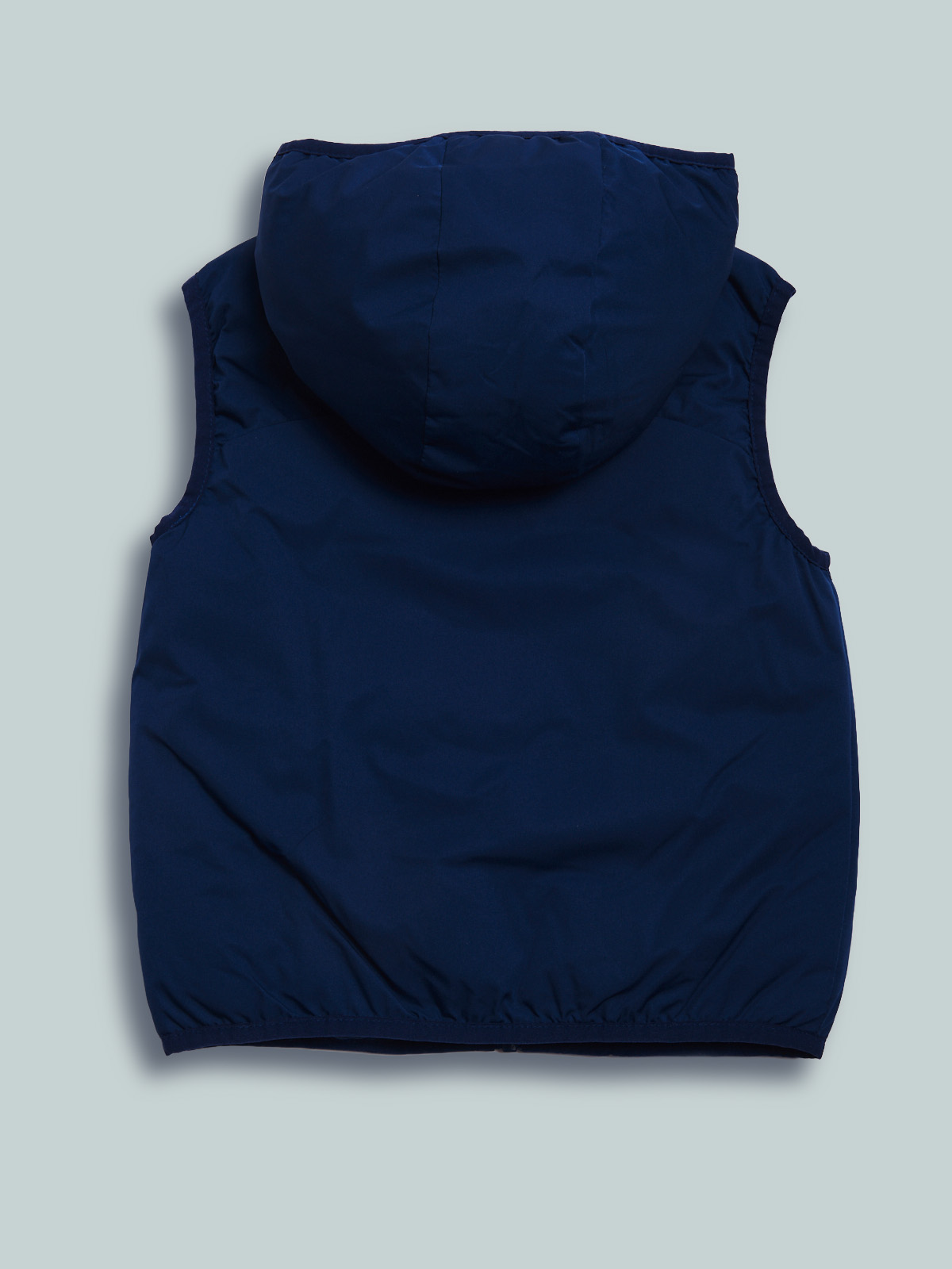 Gilet con cappuccio, in nylon imbottito leggero. Aperto davanti con zip, bordi in fettuccia elasticata, tasche applicate davanti, fodera in nylon. Un capo perfetto per la stagione primaverile.
