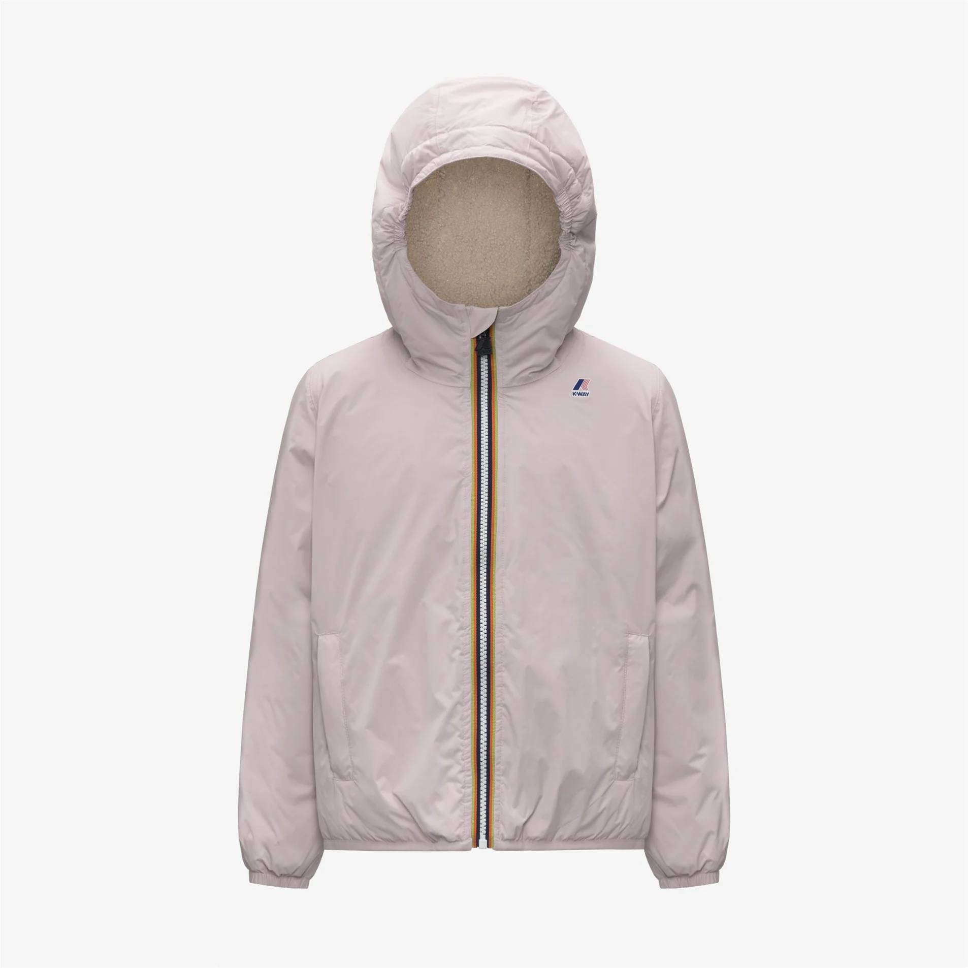 Giacca corta per bambine e ragazze firmata K-way in tessuto nylon ripstop impermeabile, idrorepellente, antivento, traspirante. Fodera in tessuto effetto sherpa. Grado di calore medio. Chiusura fullzip. Patta interna antivento. Tasche con cerniera. Regular fit.