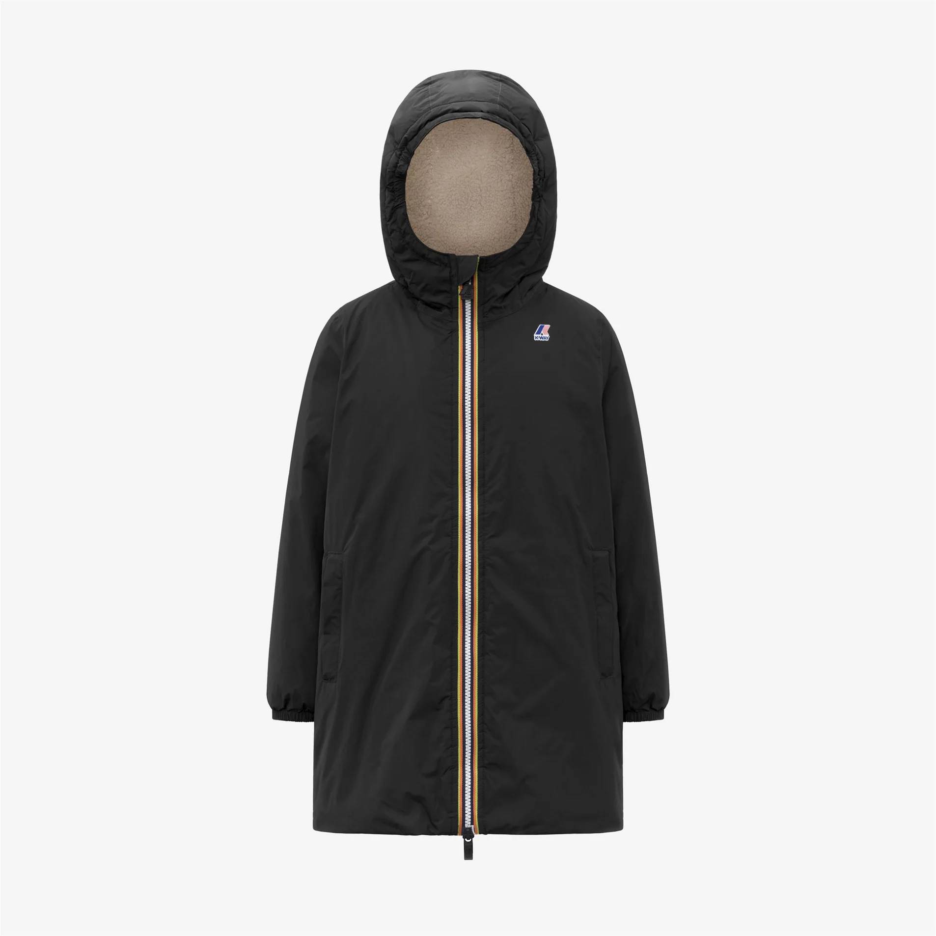 Giacca per bambini K Way Kids nero con cappuccio e fodera in pile, realizzato in poliammide 100%. Il prodotto presenta un colore nero, design con cappuccio, interamente rivestito in tessuto effetto sherpa, caldo e morbido . Chiusura con zip, maniche lunghe, zip bicolore.
