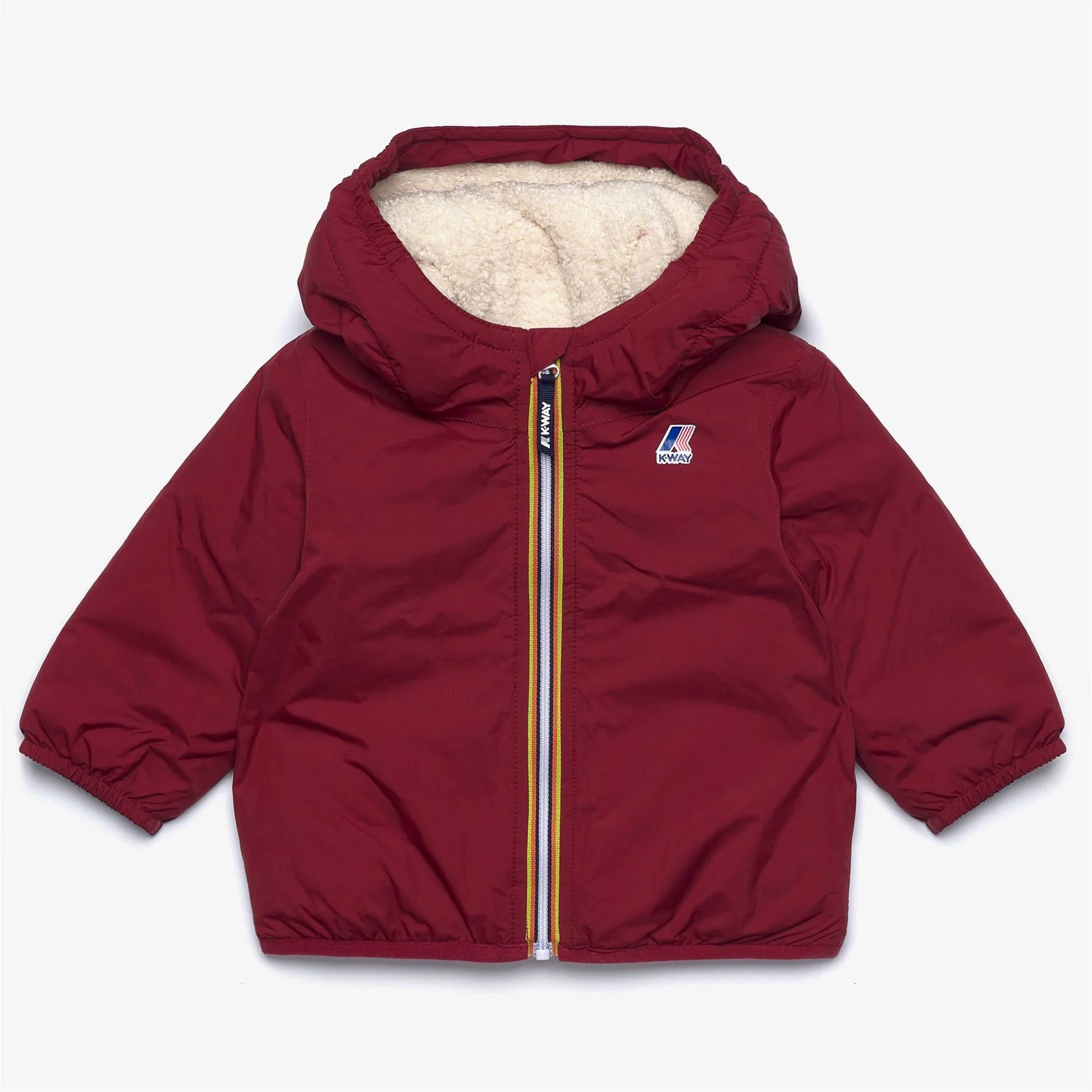 Giubbino “E. Le Vrai 4.0 claudine orsetto” K-Way, colore rosso, tessuto nylon ripstop impermeabile, idrorepellente, antivento, traspirante, fodera in tessuto effetto sherpa, grado di calore medio, cuciture termonastrate, cappuccio con bordo elasticizzato, chiusura con zip, patta interna antivento, polsini e fondo elasticizzati, 2 tasche con zip, logo stampato colorato.