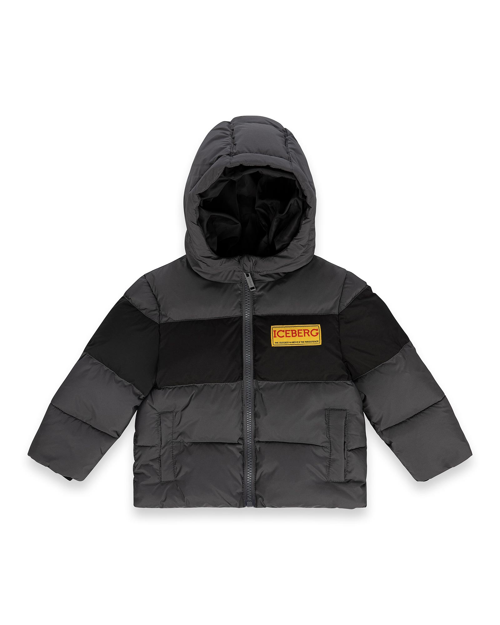 Giubbotto Iceberg con cappuccio in nylon, patch logato in petto e maxi logo stampato dietro, imbottitura calda, zip frontale e tasche laterali. Stile urbano e funzionale.