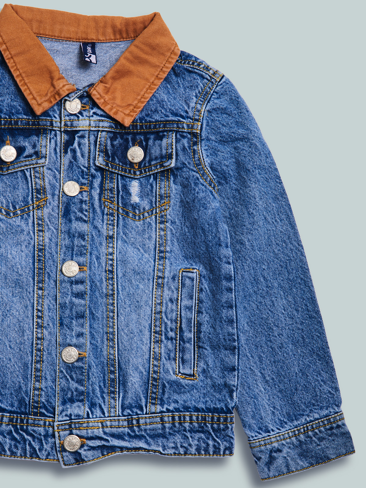 Giubbotto in denim con colletto in drill a contrasto. Aperto con pratici bottoni a chiodo, tasche davanti. Un capo classico del guardaroba, sempre di moda e che si adatta a qualsiasi look.