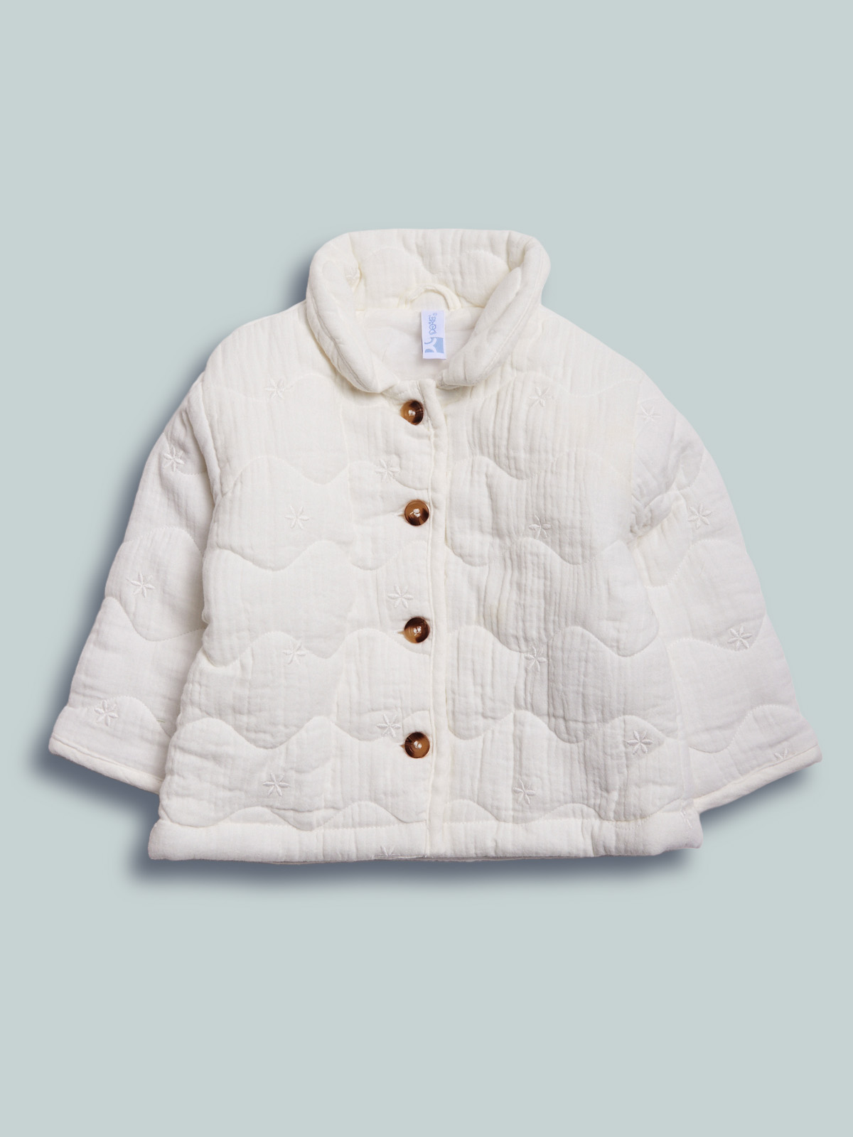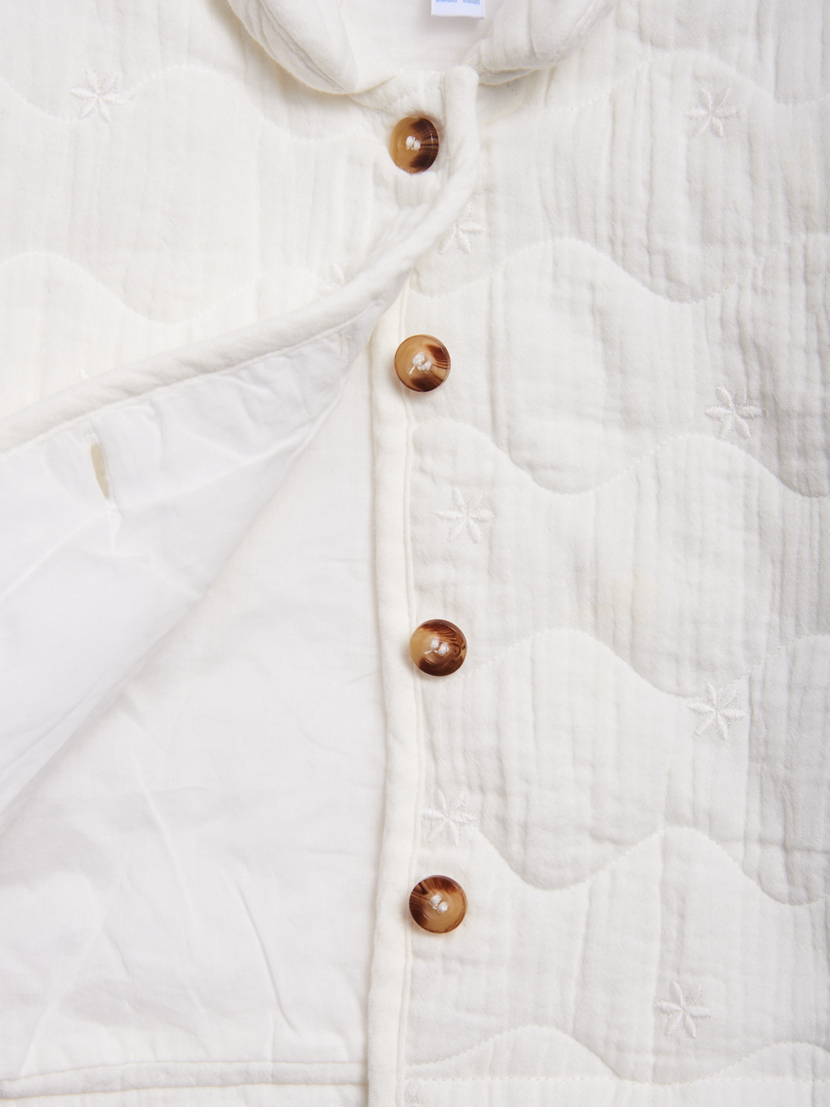 Giubbotto in morbido tessuto cotoniero trapuntato e ricamato fiori. Il capo รจ imbottito con ovatta e foderato internamente in mussola di cotone. Pratico da indossare grazie all’apertura frontale con bottoni. Colletto tondo per maggiore femminilitร . Un capo fashion ed estremamente pratico.