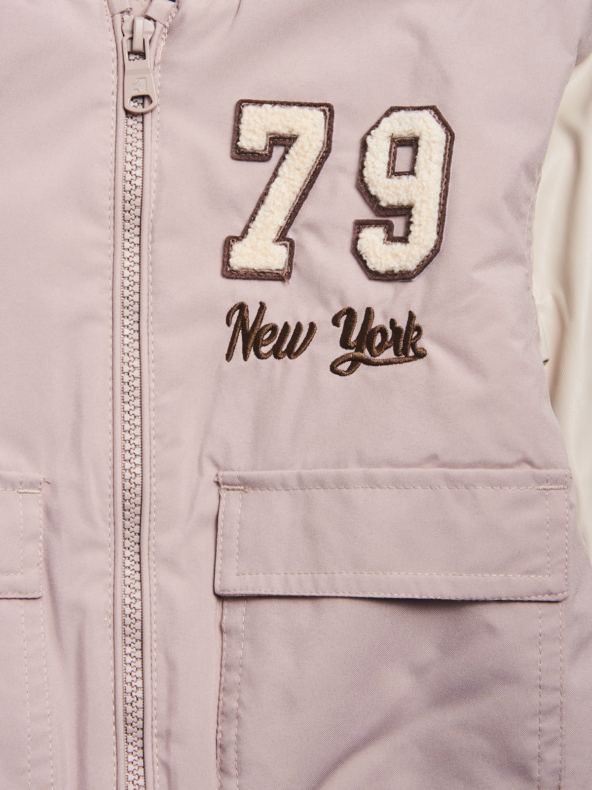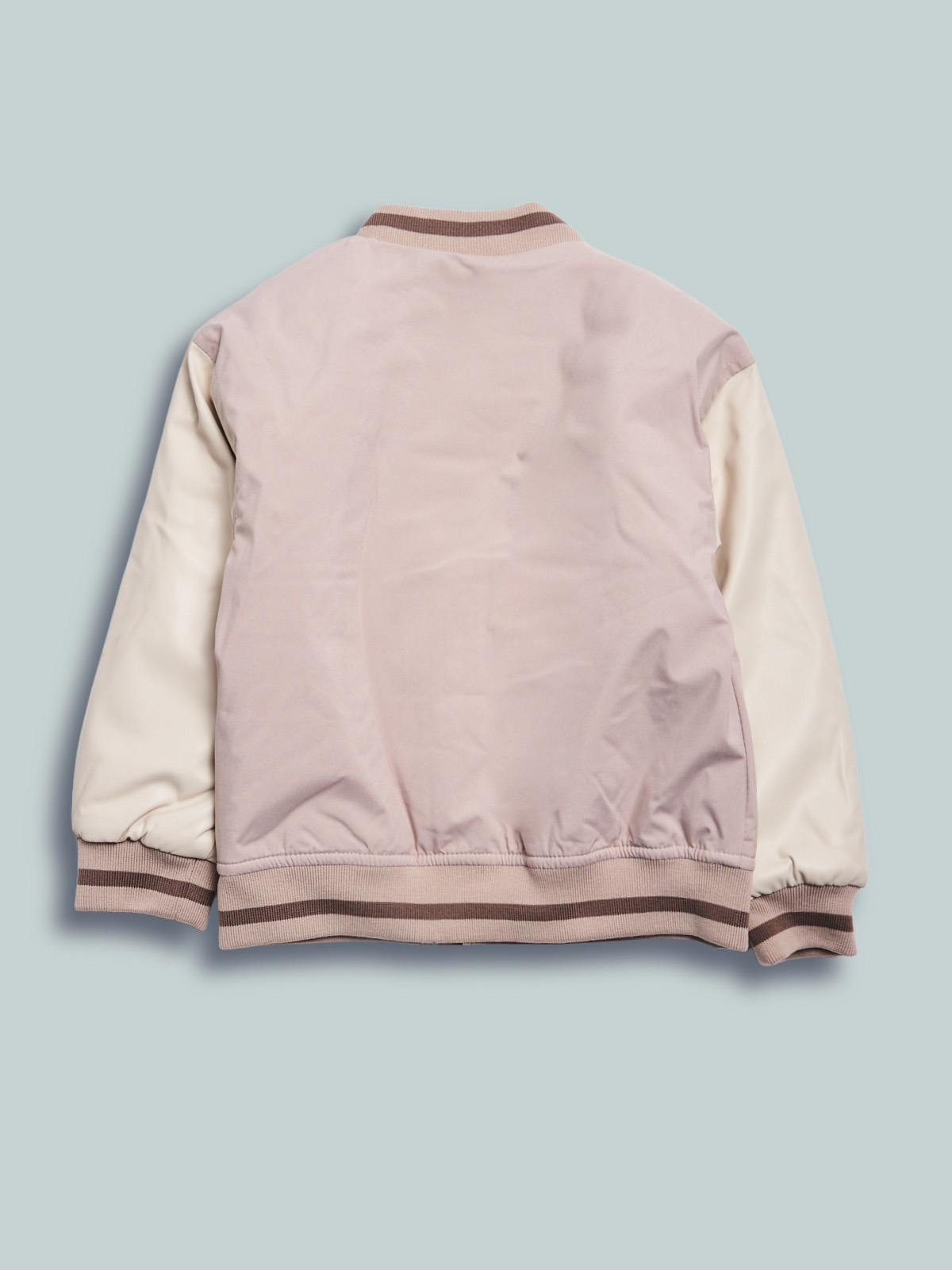 Giubbotto in nylon modello bomber, maniche in tessuto spalmato a contrasto, imbottitura leggera. Aperto davanti con lampo, tasche con pattine. Morbida costina rigata per collo, fondo e polsi. Ricamo effetto spugna sul petto. Fodera in nylon. Un capo in stile college, vera tendenza di stagione.