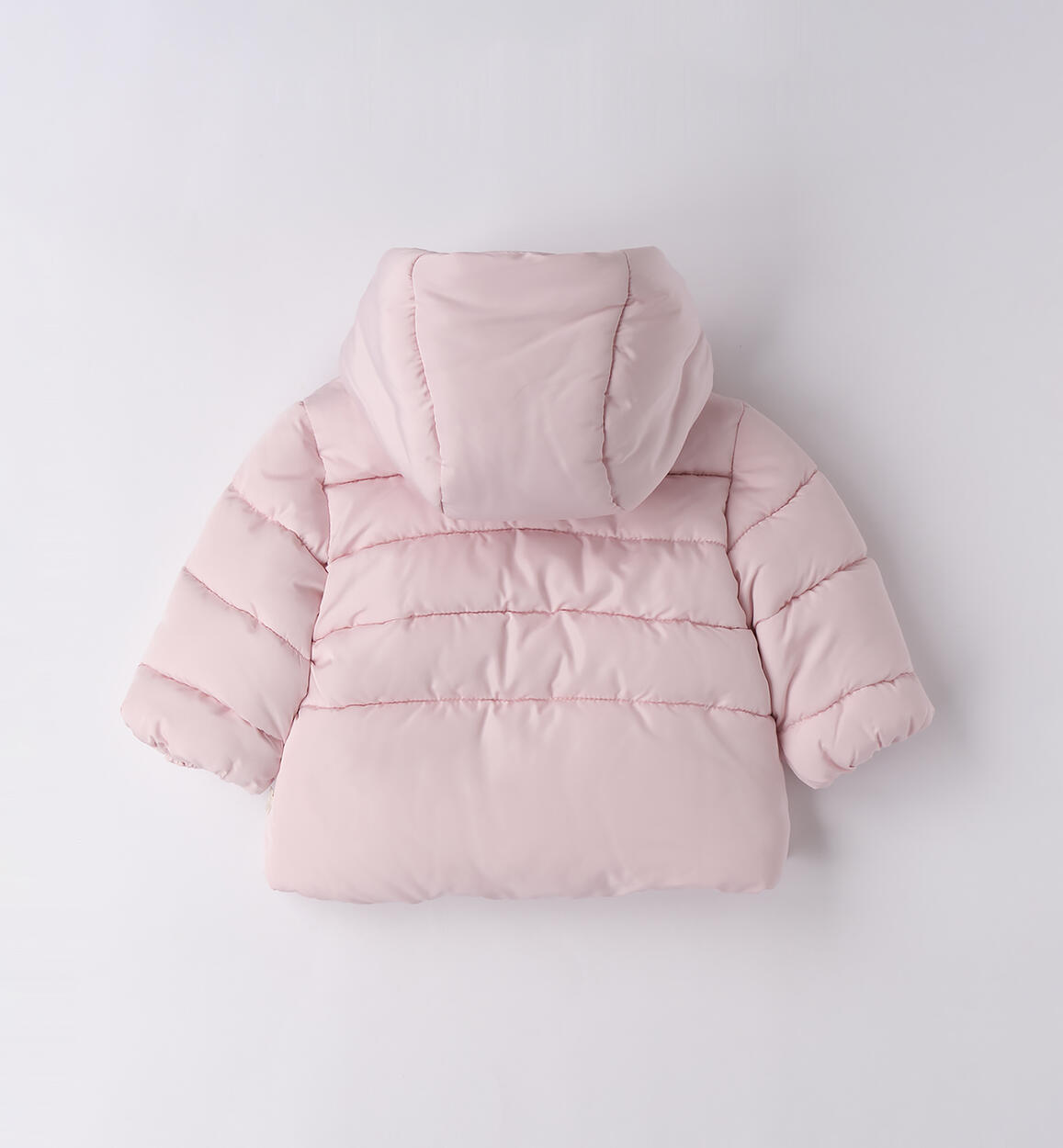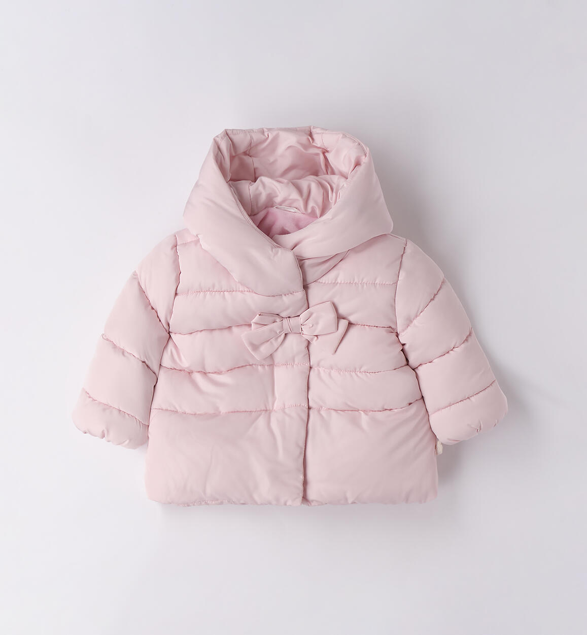 Piumino imbottito in ovatta per neonata Minibanda 1-24 mesi realizzato con fodera in caldo e morbido tessuto. Il modello presenta apertura con zip e bottoni. Il giubbotto รจ arricchito da cappuccio e fiocco.