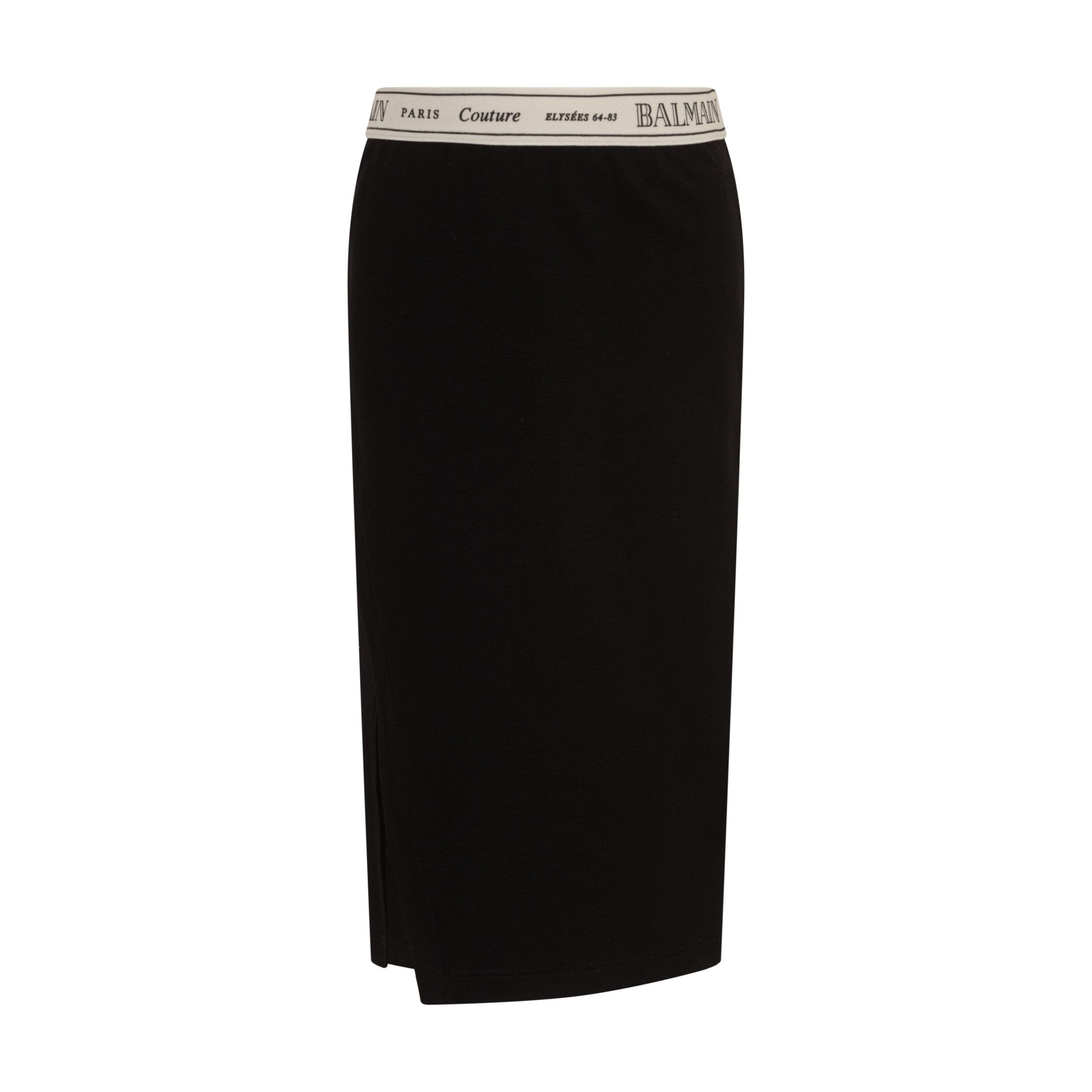 Gonna in jersey per bambine e ragazze Balmain Kids nera elasticizzata. Il prodotto presenta elastico in vita di colore bianco, dettaglio con logo, lunghezza midi e spacco laterale. Realizzata in 71% viscosa, 24% poliammide, 5% elastan.