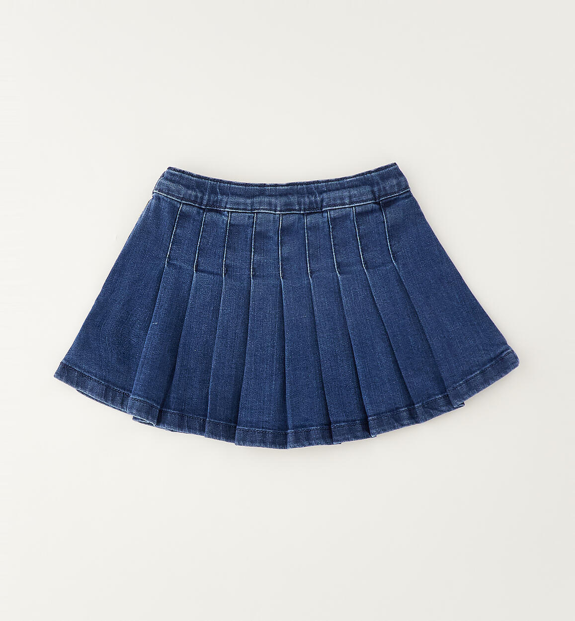 DESCRIZIONE Gonna in denim stretch di cotone per bambina Sarabanda. Apertura laterale con zip e bottone. Modello a pieghe, lunghezza mini. Vita regolabile con elastico asolato interno Composizione Colore BLU LAVATO: 97%Cotone 3%Elastan