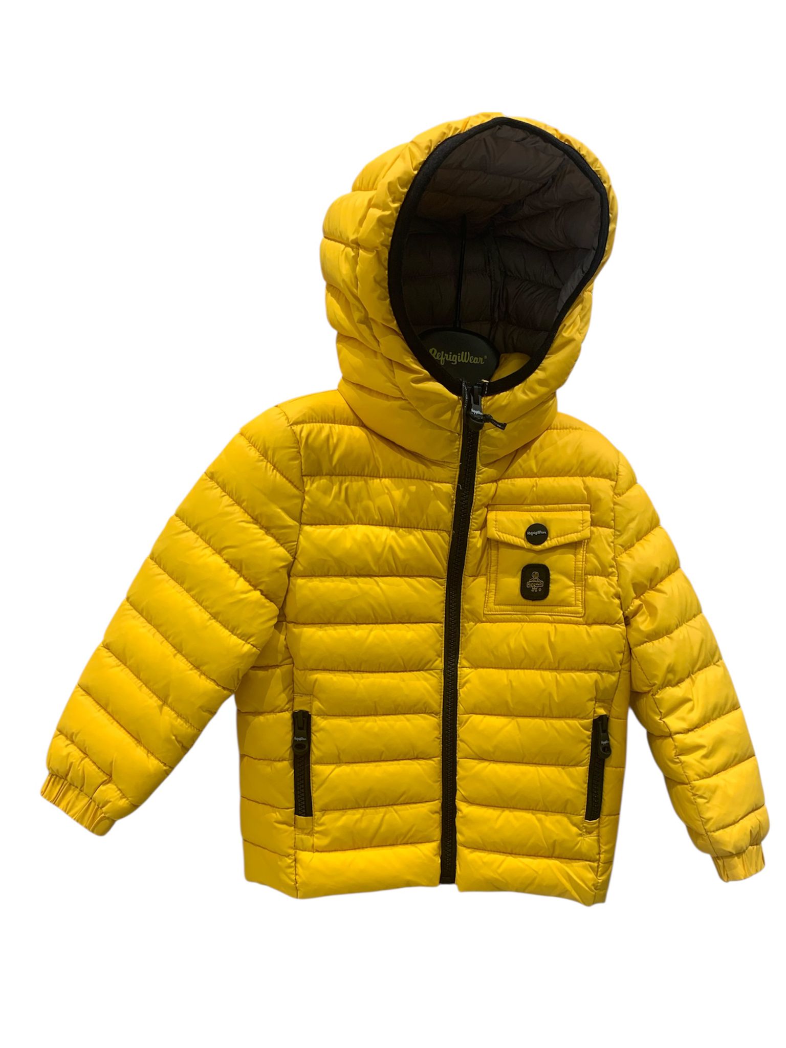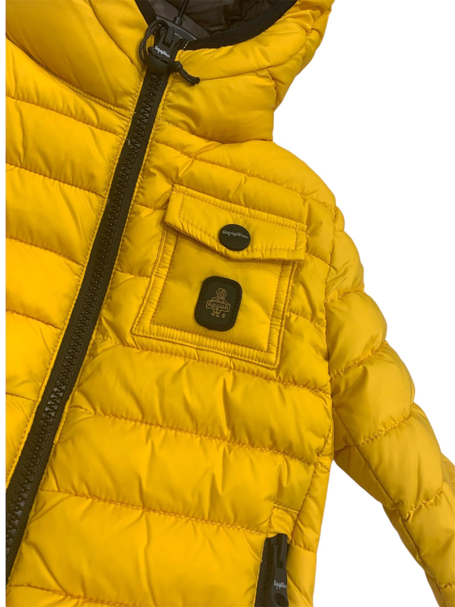 Giubbino Refrigiwear con imbottitura Sorona Aura colore giallo con taschino e cerniere nere identificativo del marchio