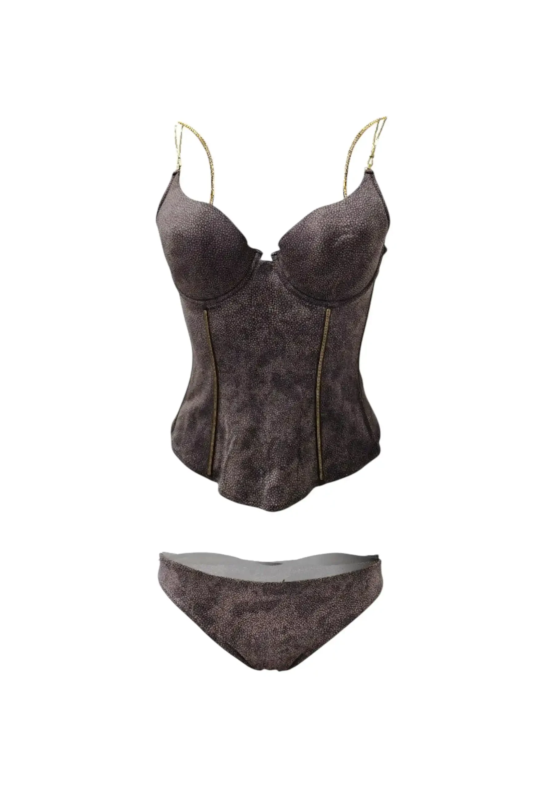 preziosa Guepiere Made in Italy fondo moro con fantasia borbonese. Stecche e bretelle gioiello e perizoma coordinato. Taglia 3ยฐ 73% poliammide 27%elasta