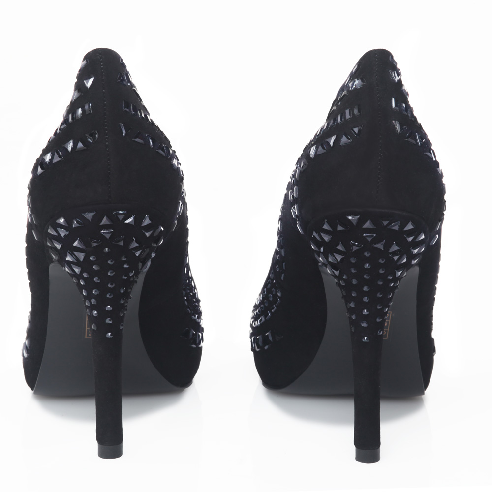 Eleganti décolleté Guess nere in camoscio con applicazioni di strass. Modello FL4AVASUE08 con tacco alto da 11 cm e plateau 1,5 cm, ideale per look da sera.