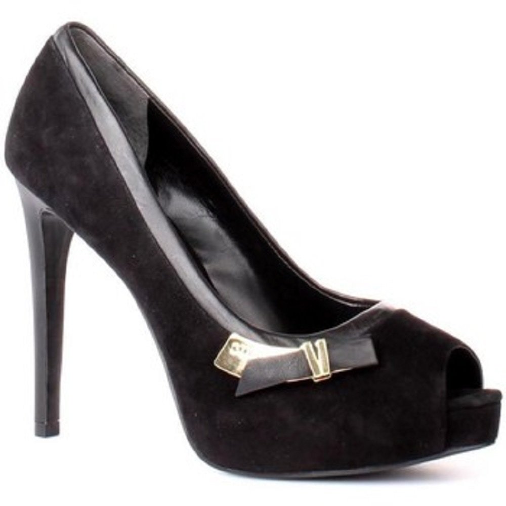 Il tacco a spillo di 11 cm è bilanciato da un comodo plateau di 3 cm, offrendo un’altezza complessiva della scarpa di 17 cm e slanciando la silhouette senza rinunciare al comfort. La tomaia mista pelle/camoscio è impreziosita da un fiocco laterale che cattura la luce.
