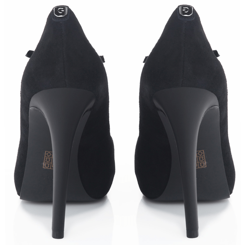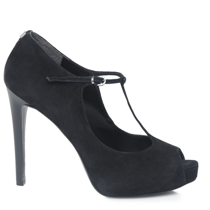 Décolleté Guess donna in suede nero con design open toe, chiusura a T regolabile, tacco alto 12 cm e plateau 2 cm. Elegante e slanciata.