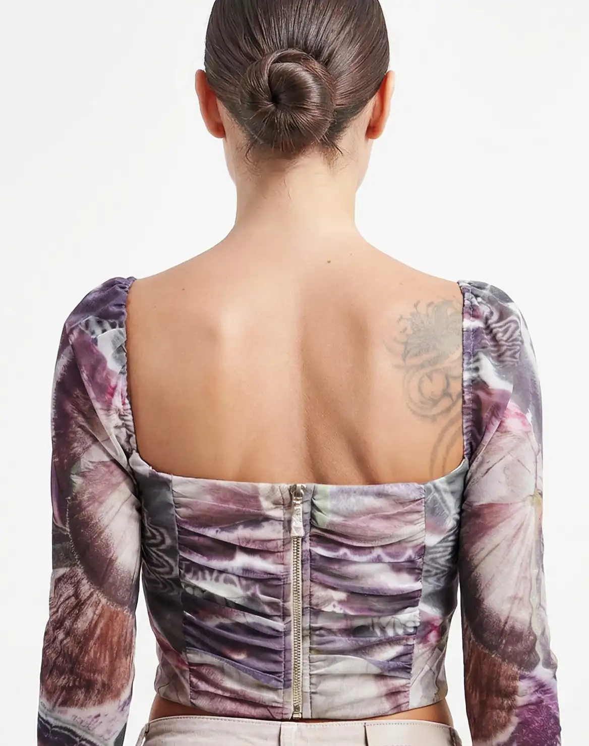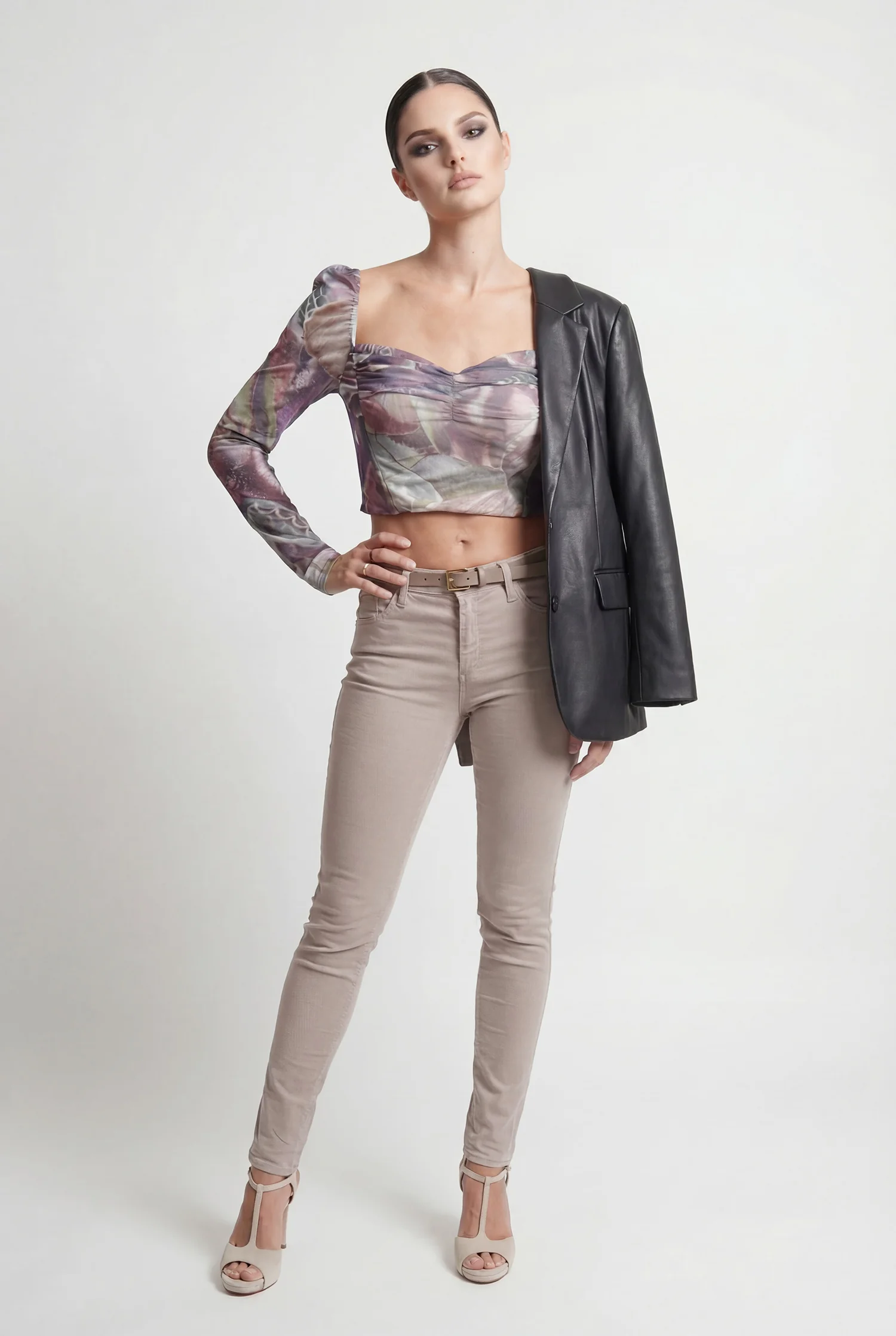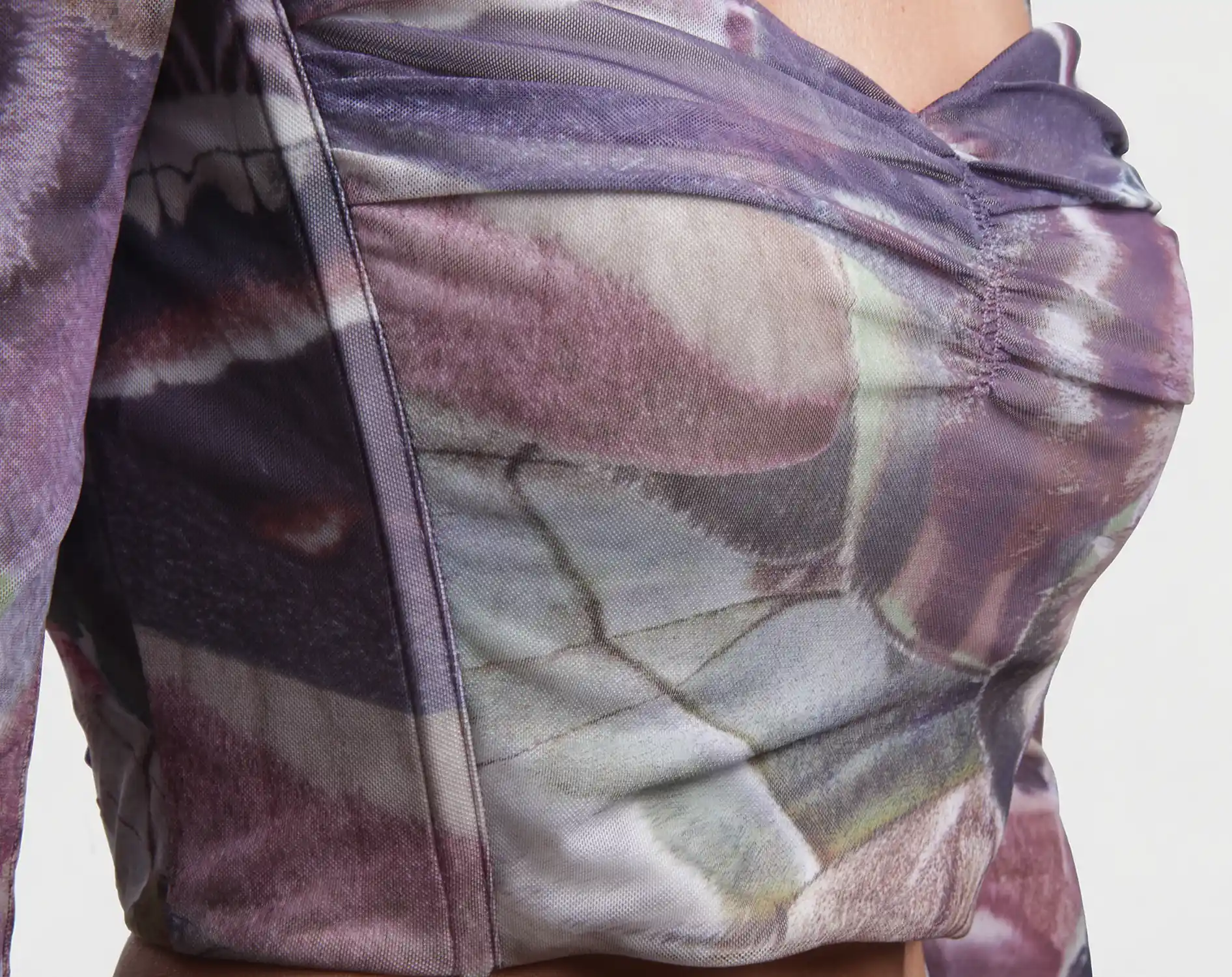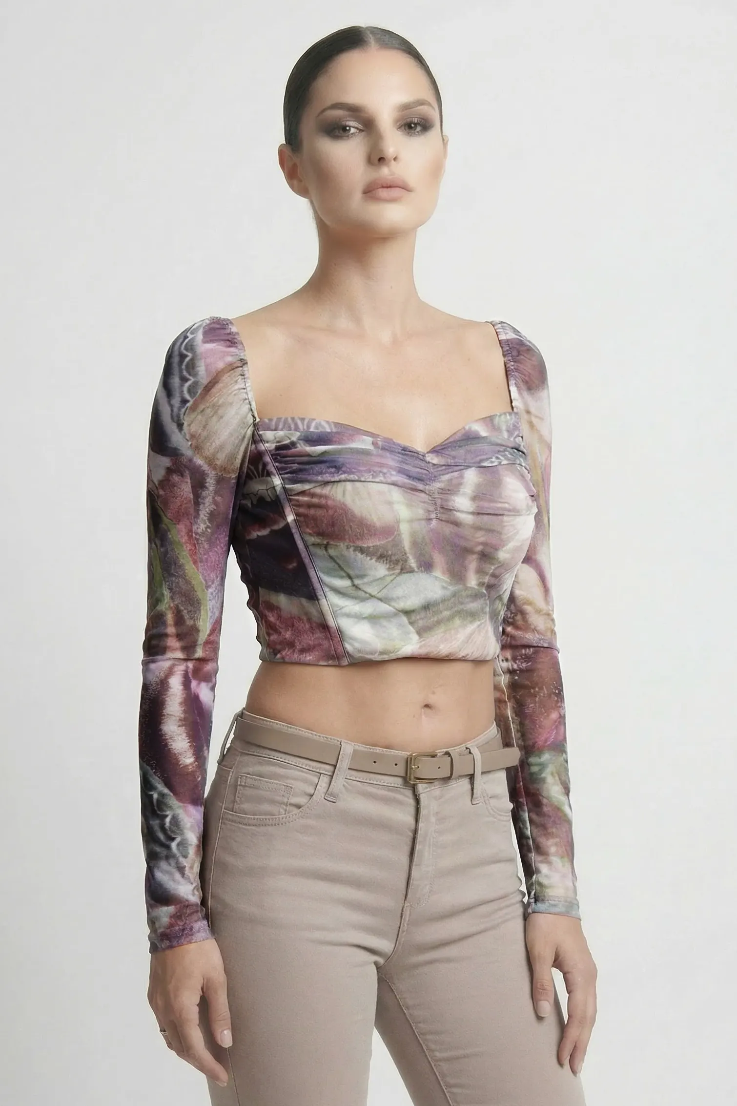 Modello: Bustier crop top a maniche lunghe con scollo drappeggiato.