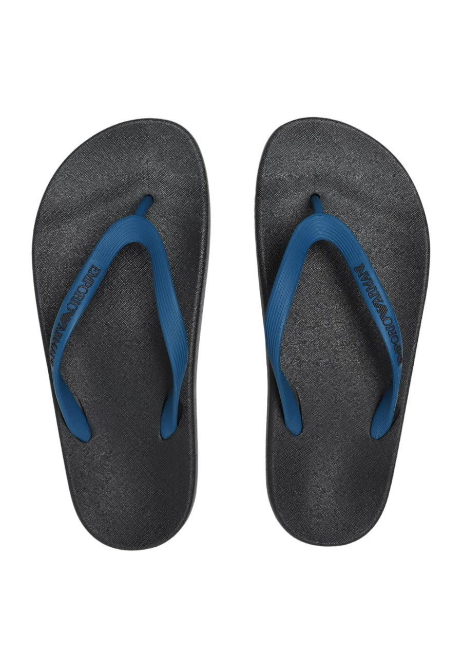 infradito Emporio Armani fondo grigio antracite e dettagli blu. Maxilogo in rilievo contrasto tomaia 100% gomma , suola 100% polivinile, restante pvc