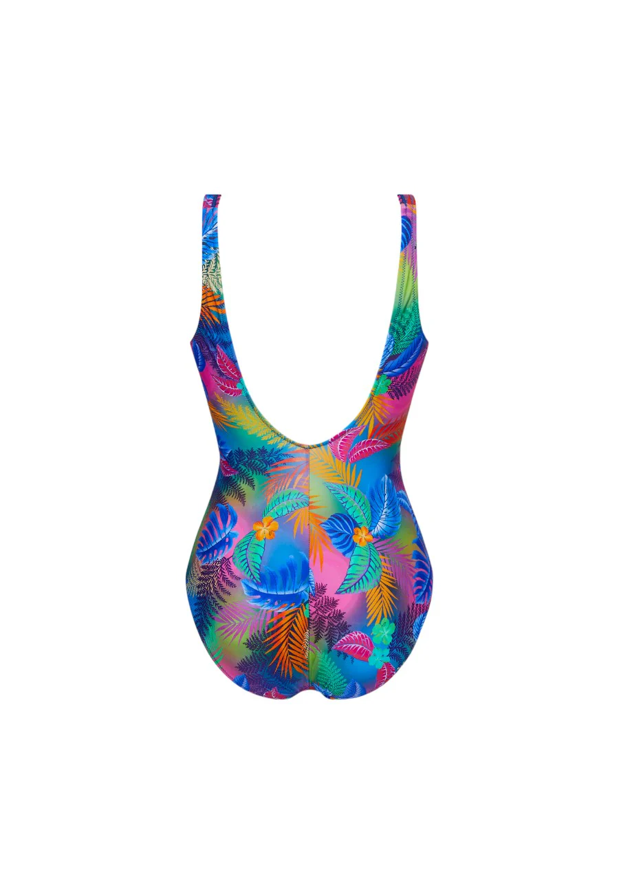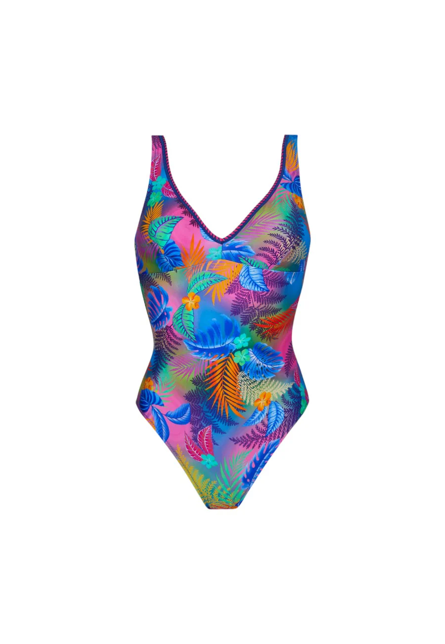 Intero coppa D con sostegno elastico. Fantasia avatar multicolor con dettagli passamanerie.Coppa D 78% poliammide 22% elastan