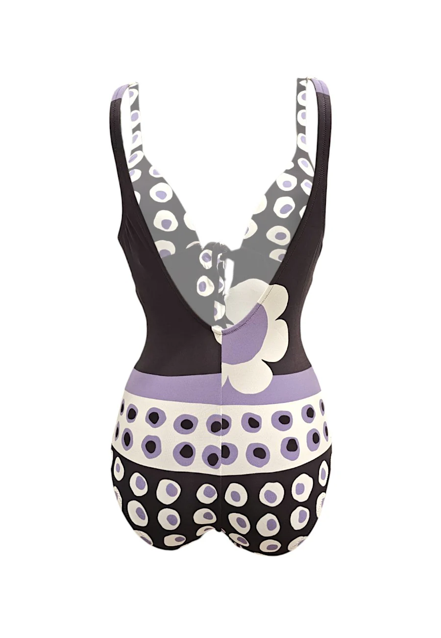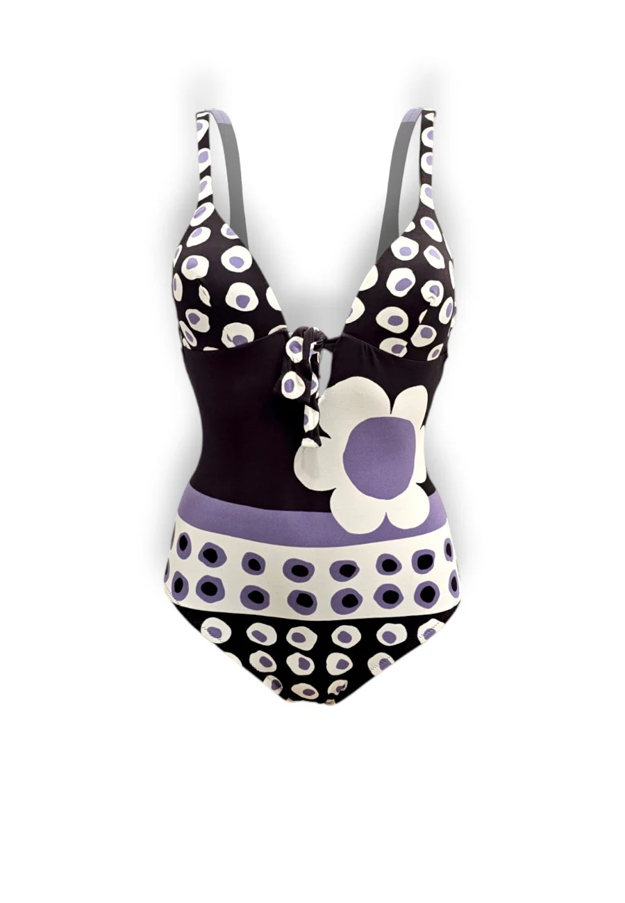 Intero imbottito con mix fantasie su fondo marrone. Scollatura sulla schiena Made in Italy 90% poliammide 10%elastan