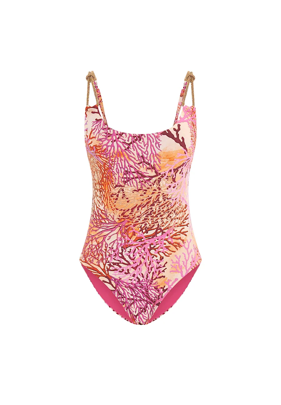 Fantastico costume intero fantasia coralli con bretelle gioiello regolabili e coppe removibili. Illumina le tue giornate al mare con eleganza