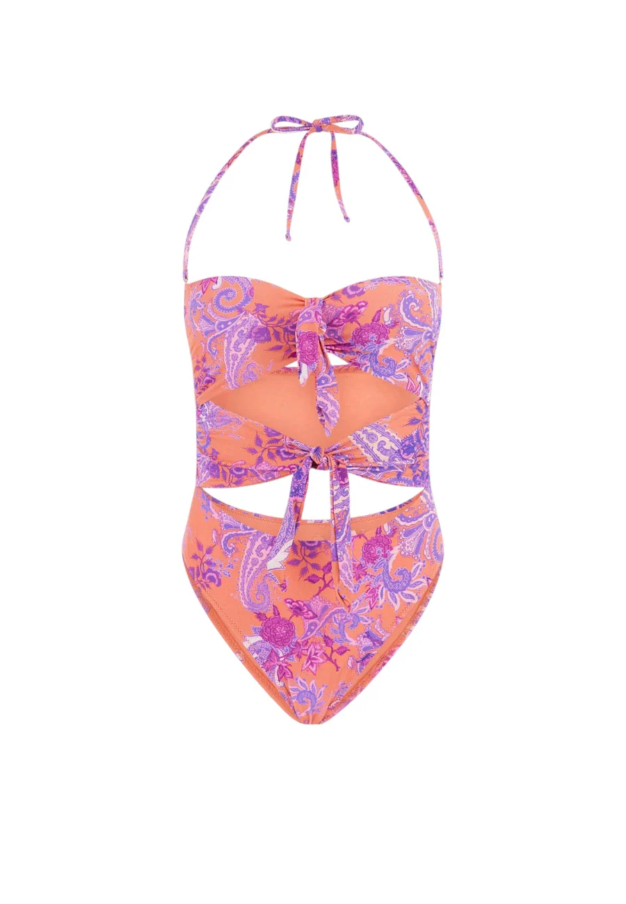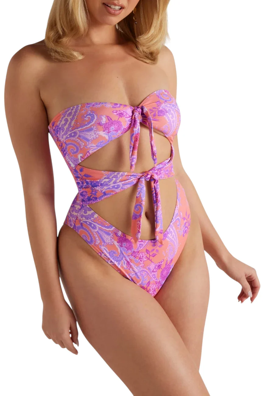 Elegante costume intero a fascia in jersey stretch con coppe imbottite rimovibili. Stampa paisley all-over , dettagli cut-out anteriori e posteriori. Nodi decorativi sul davanti.