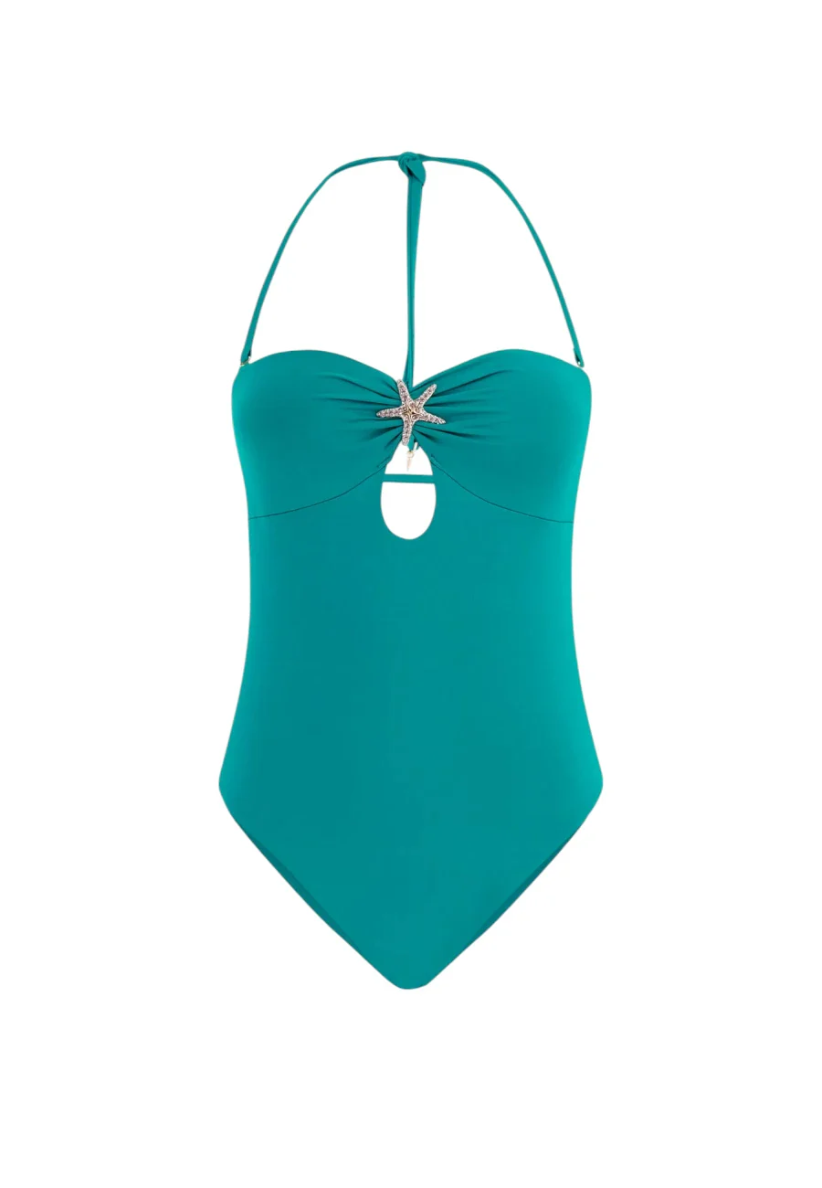 Costume intero a fascia in jersey stretch con scollo allโamericana e allaccio posteriore. Sottile laccetto posteriore regolabile e stella marina decorativa di strass e charm con logo triangolo.