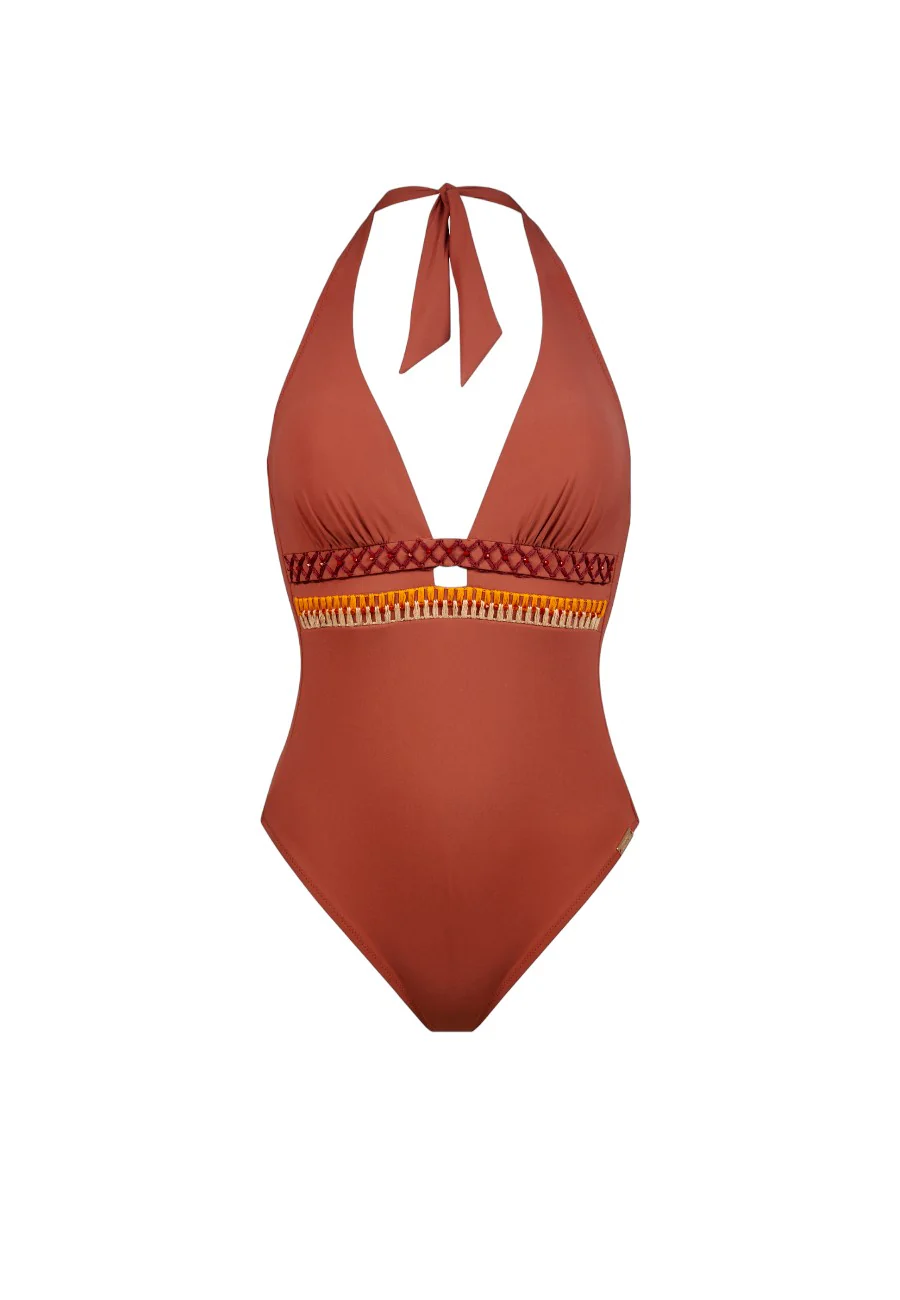 Coppa CLusso bohรฉmien realizzato a mano dedicato dalla vitalitร . La โcittร rossaโ ha ispirato questocapo. La tavolozza dei colori evoca una sensazione risonante, ma infusa dal sole. Tonalitร del tramonto e argilla come colori distintivi. 72% poliammide, 28% elastan.