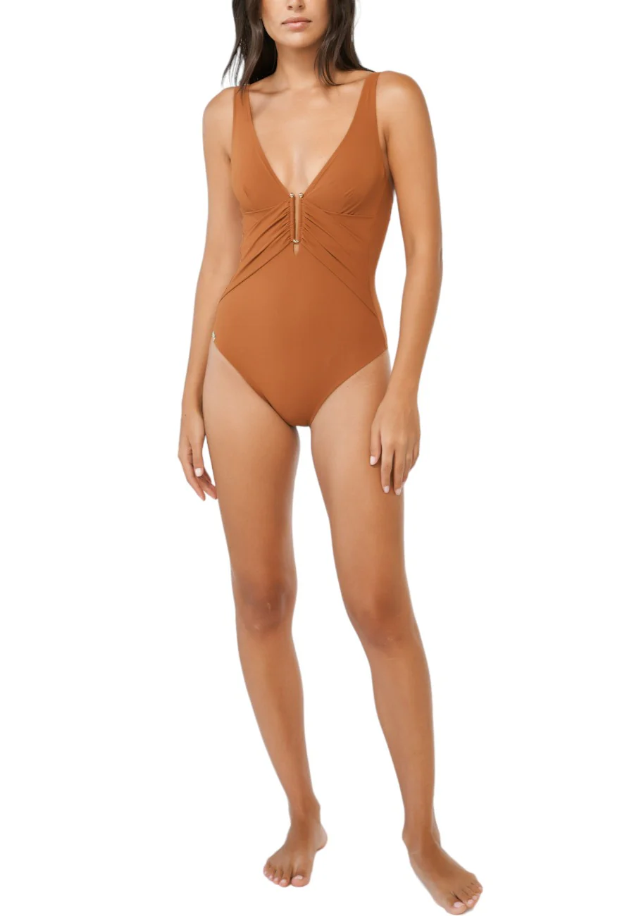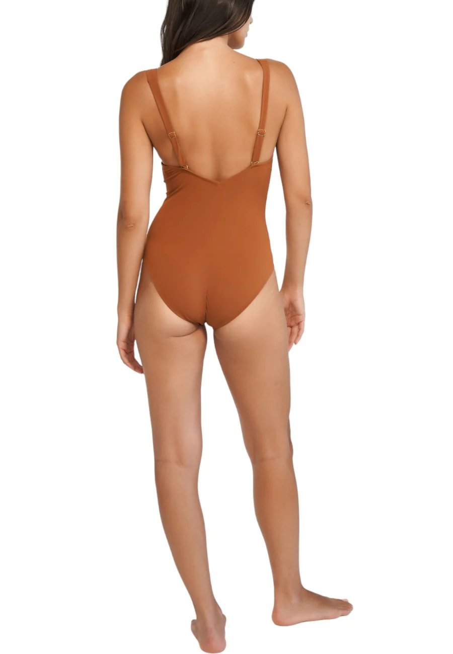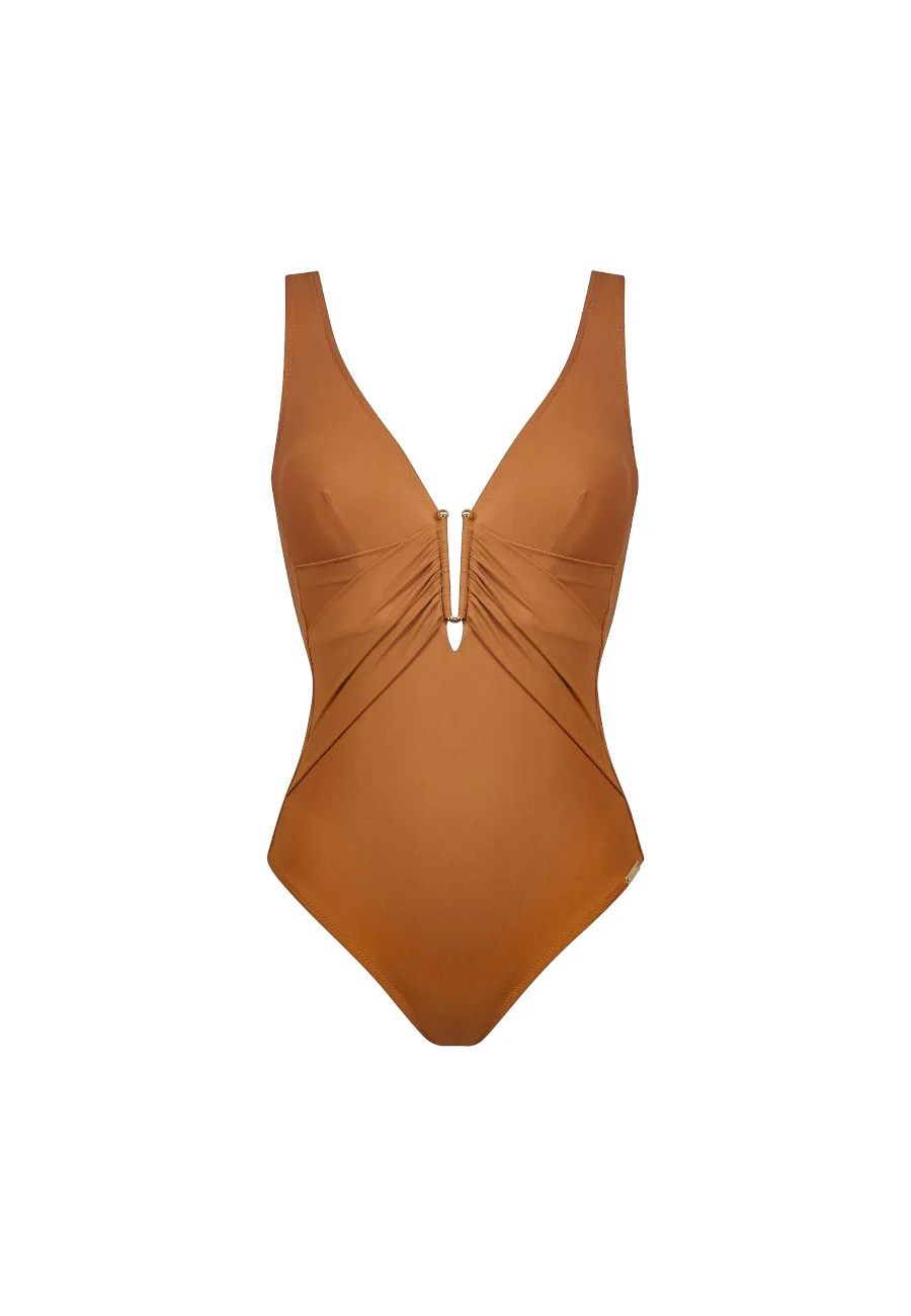 Contorni morbidi e dettagli di alta qualitร arricchito da dettaglio a U realizzato in metallo zincato che accentua la profonda scollatura. L’orlo basso รจ un elemento di stile inconfondibile. Look sottilmente seducente che mette in risalto la vita, sostenuto da drappeggi che accentuano la silhouette femminile. Costume da bagno con ferretto e profondo scollo a V con separatore decorativo sull’orlo. Busto completamente foderato. Cinghie regolabili in lunghezza, rimovibili nella parte posteriore per opzioni variabili.