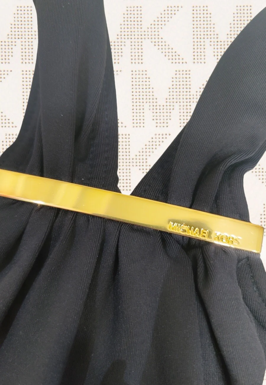 Costume intero con imbottitura estraibile e fascia elastica per sostenere il seno ed enfatizzare la silhouette. Applicazione in metallo che detta i canoni stilistici del brand