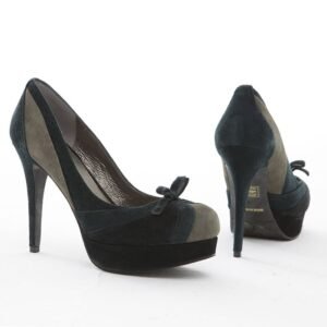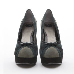 Decollete donna scamosciata tacco alto Roberto Botella, con fiocco decorativo, punta arrotondata, plateau 3 cm e tacco 12 cm. Colore petrolio e grigio. Elegante e femminile.