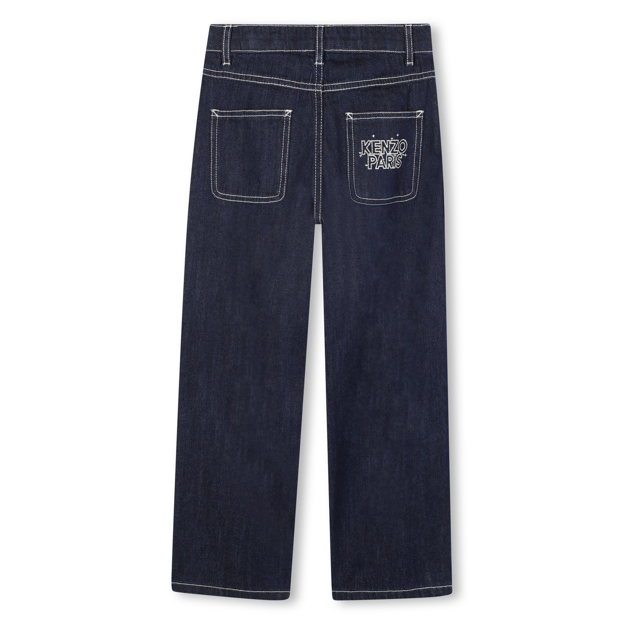 Jeans per bambini e ragazzi in denim scuro con vestibilitร comoda; impunture colore bianco e tasconi posteriori con logo ricamato.