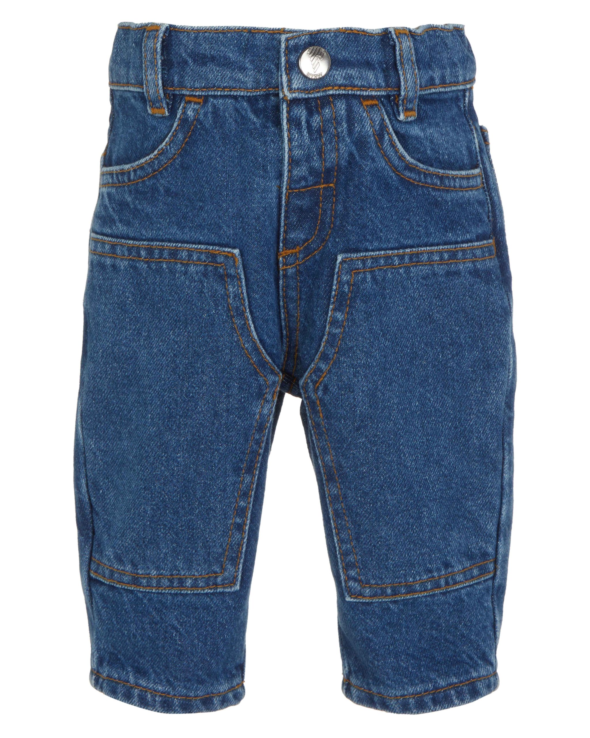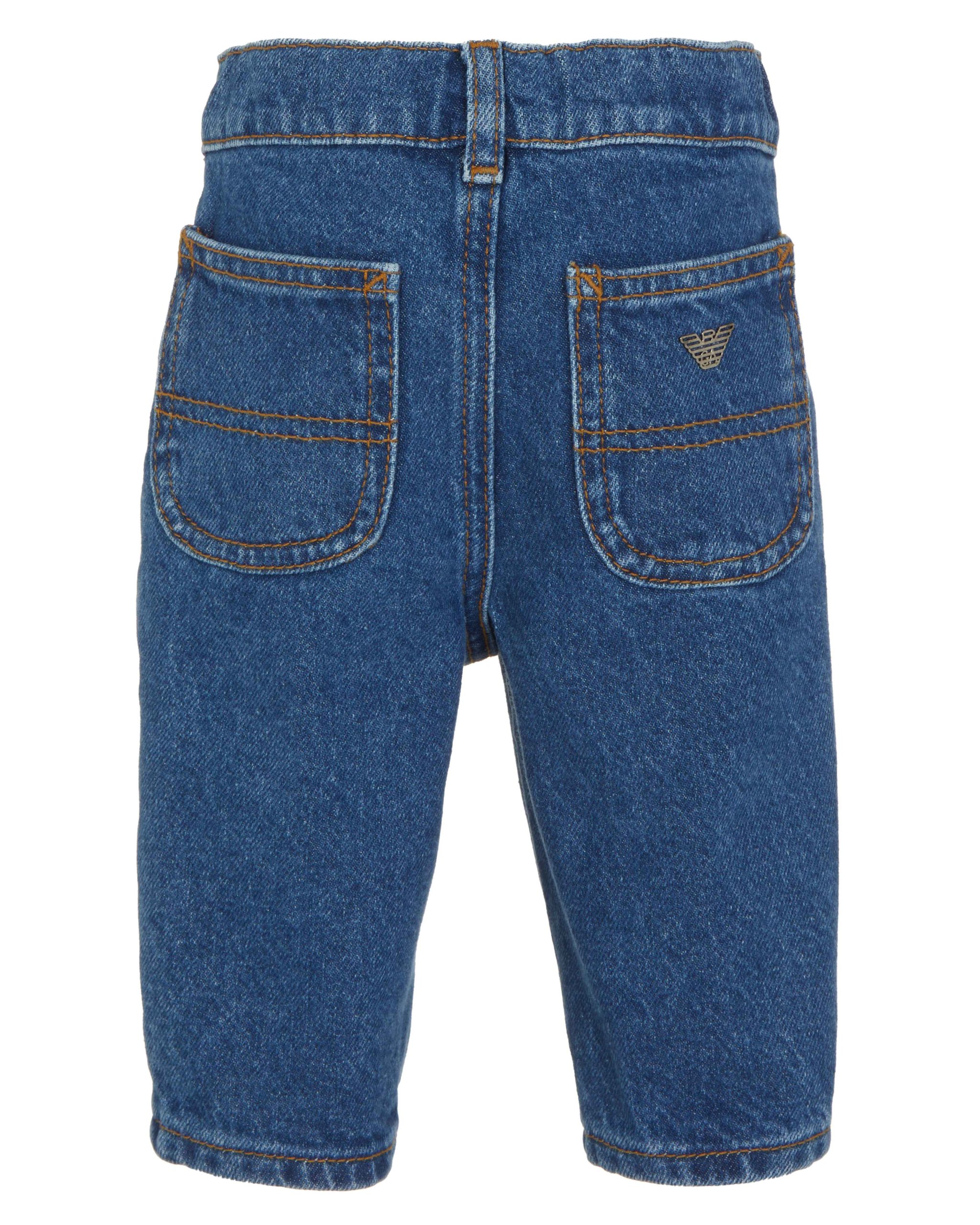 Jeans colore denim per neonati, chiusura con bottone automatico ed elastico interno. Logo Armani sulla tasca posteriore.