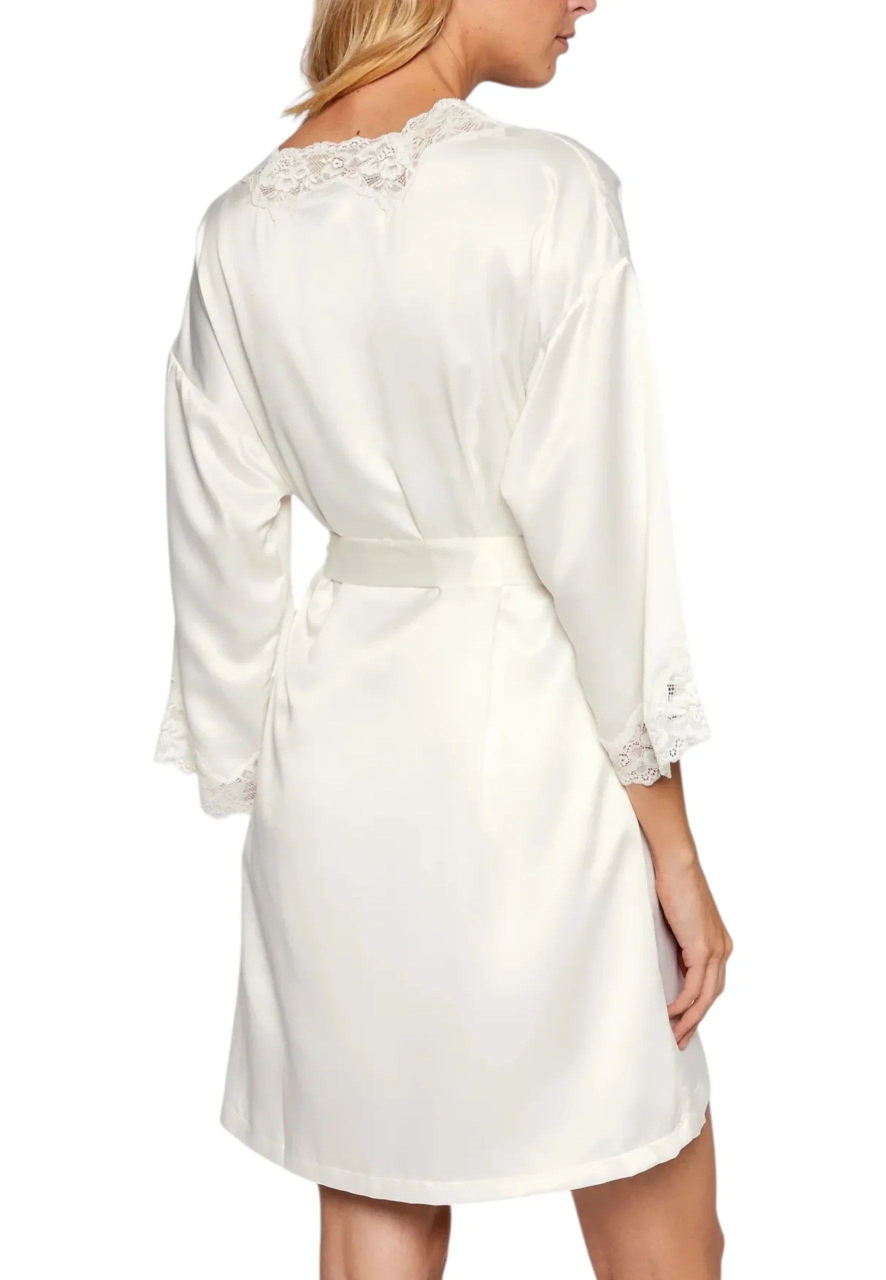 Vestaglia taglio chimono avorio in splendido raso con profili in pizzo. 100% poliestere