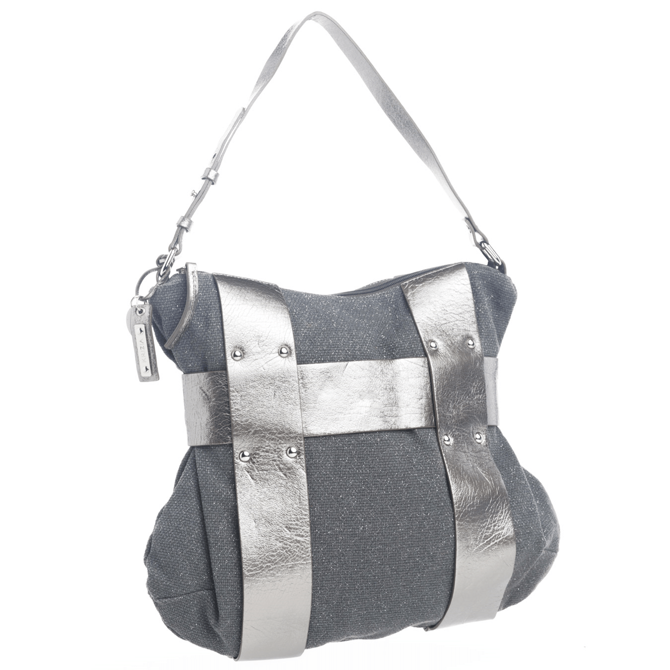 La borsa a spalla donna firmata KRIZIA rappresenta un perfetto equilibrio tra estetica moderna e funzionalità quotidiana. Il corpo principale, realizzato in cotone color grigio fumo di londra, presenta un delicato effetto brillantinato che dona luminosità a ogni outfit. Il design è impreziosito da vistose bande orizzontali e verticali in pelle argentata con finitura metallizzata, fissate da borchie piatte che richiamano lo stile industriale di lusso.