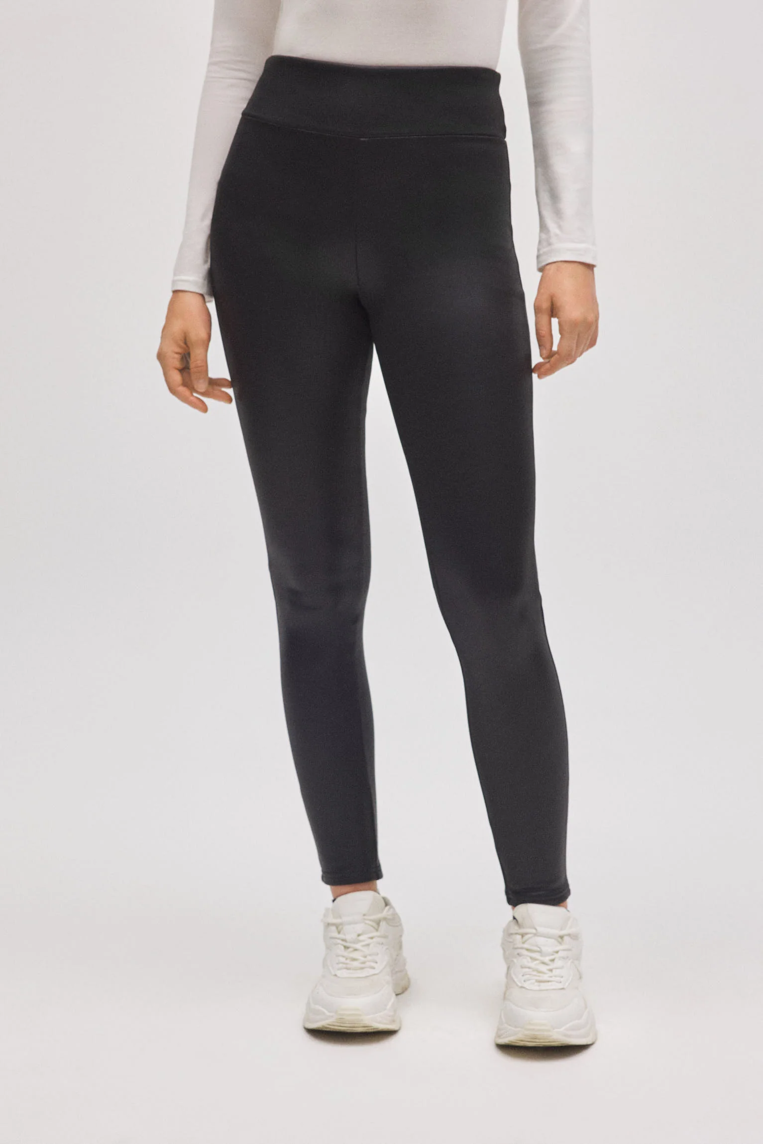 Leggings termici effetto pelle con ampia fascia elastica a vita alta e finitura effetto pelle. Un capo versatile ideale per i climi freddi.