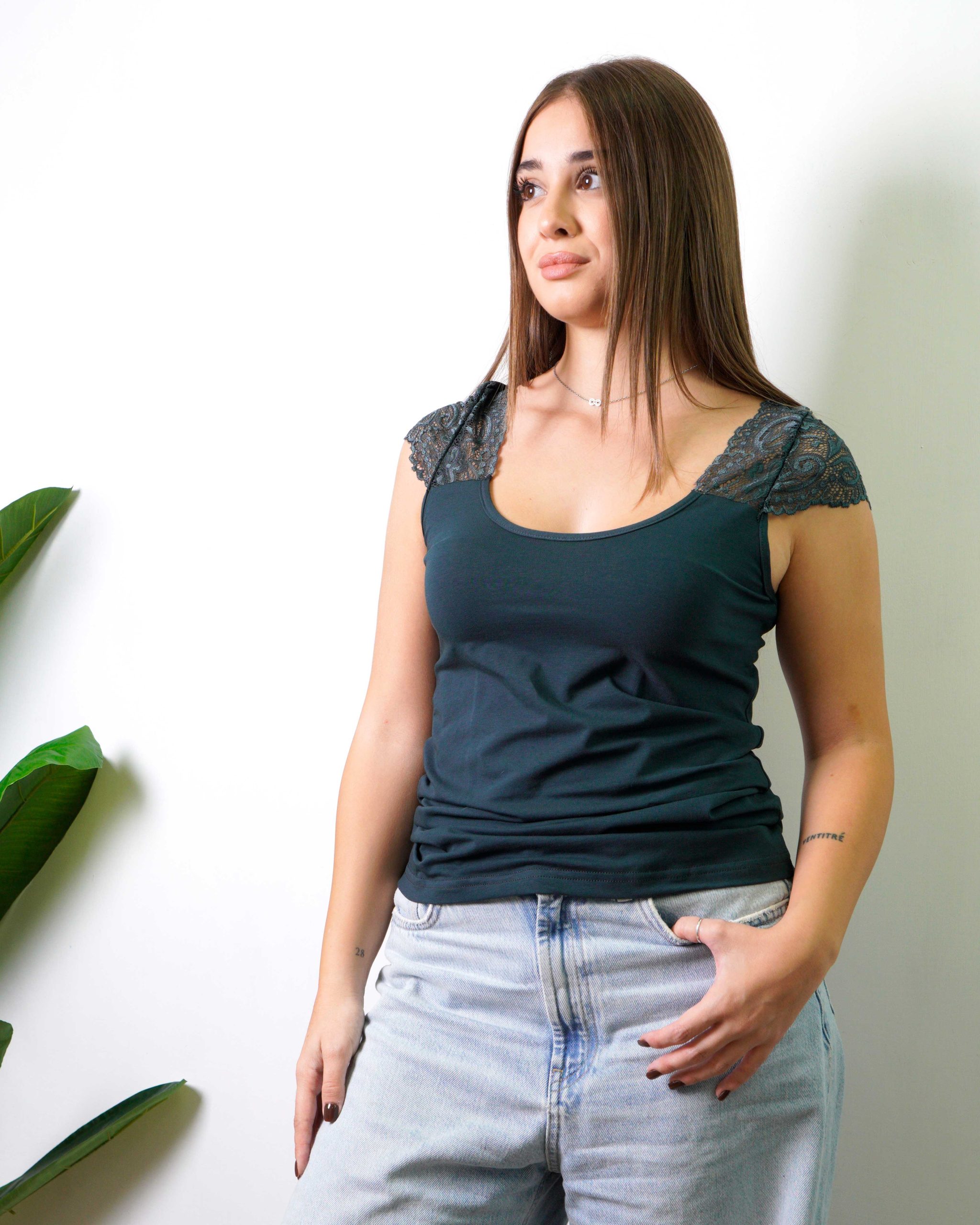 MAGLIA DONNA MEZZA MANICA IN PIZZO Colorazione Oliva Cotone Bielastico Composizione: 90% COTONE โ 10% ELASTAN Vestibilitร Bi taglia tg. S/M โ 42/44 tg. L/XL โ 46/48 La modella in foto รจ alta 160 cm e indossa una taglia S/M