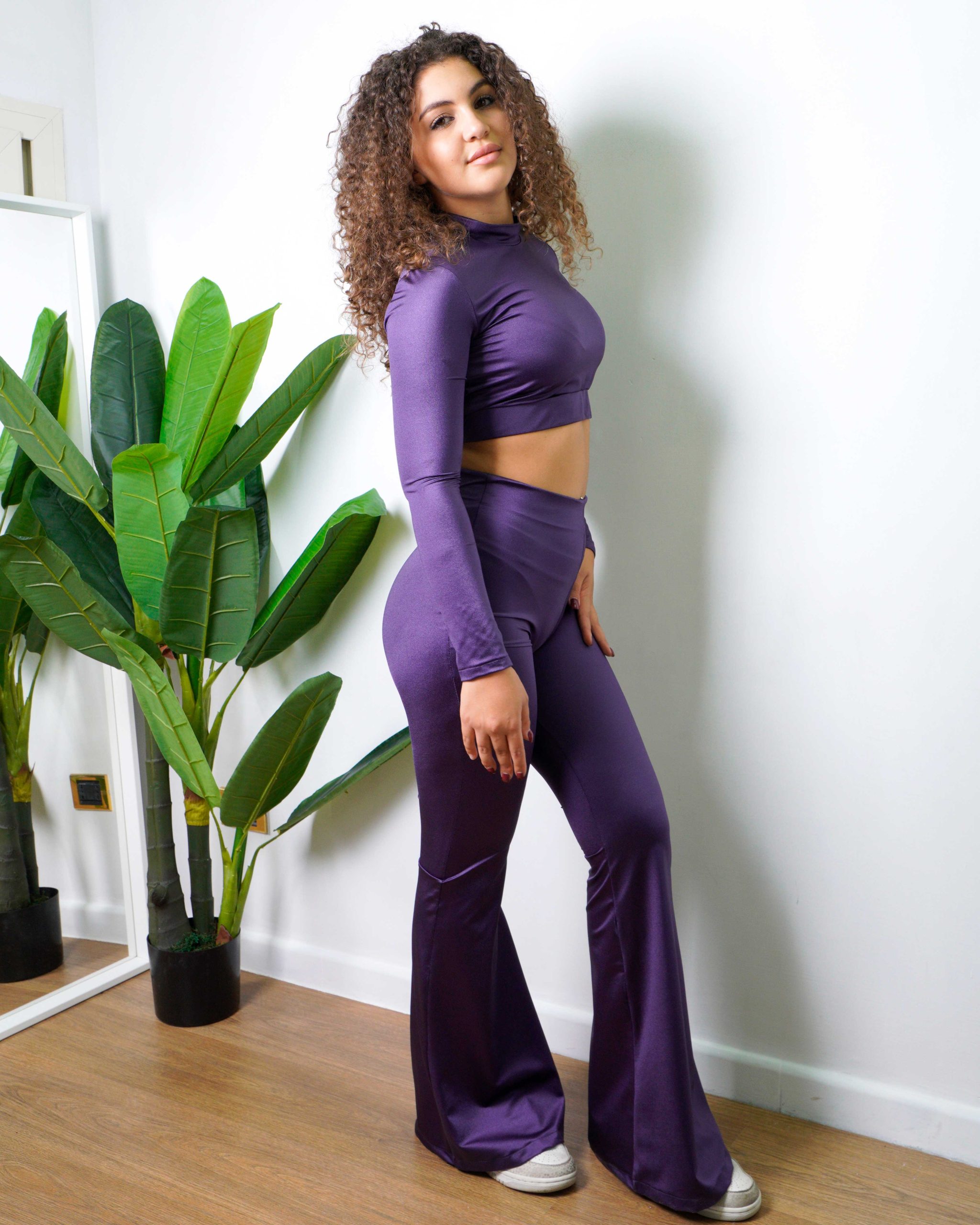 Maglia crop manica lunga con elastico sottoseno. Tessuto effetto lycra lucido Colorazione Purple Effetto super glow sotto la luce Vestibilitร stretta, se preferisci vestire piรน larga scegli una taglia in piรน. Composizione: 80% Poliammide – 20% Elastan La modella in foto indossa una taglia XS/S, รจ alta 165 cm
