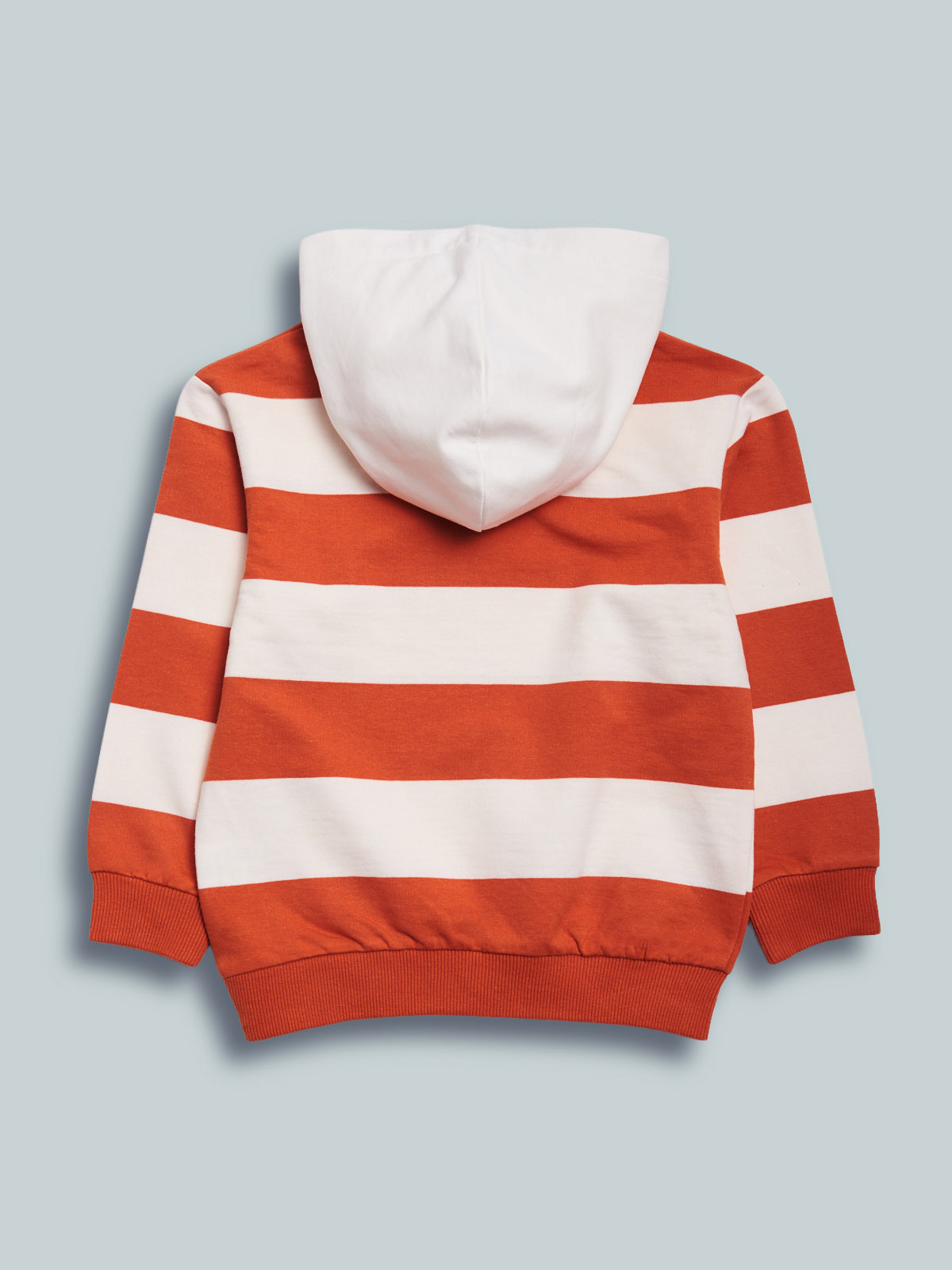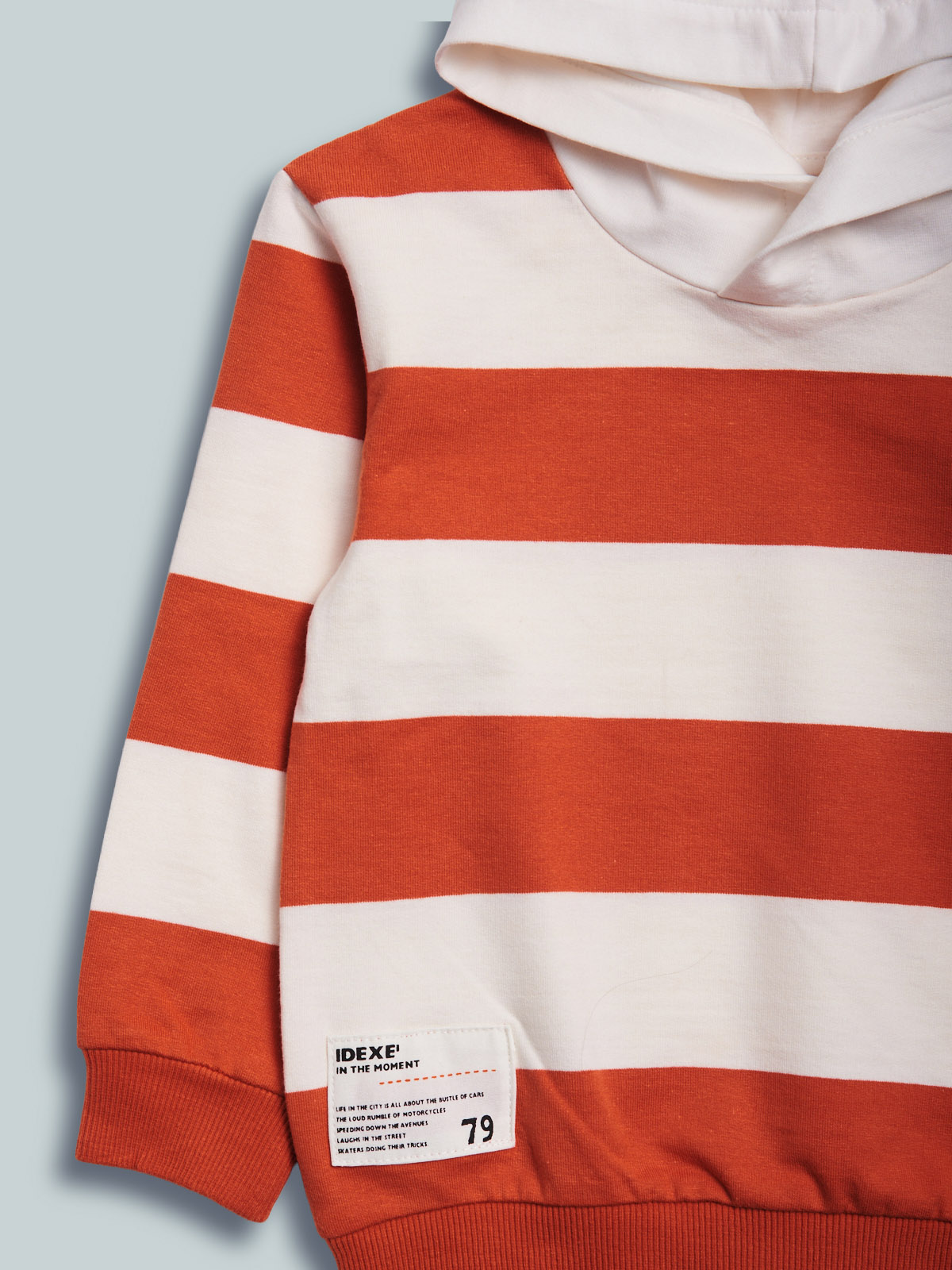 Maglia con cappuccio in morbida felpa leggera rigata, polsi e fondo in costina, etichetta sul fondo. Un capo di tendenza per essere comodi e alla moda.