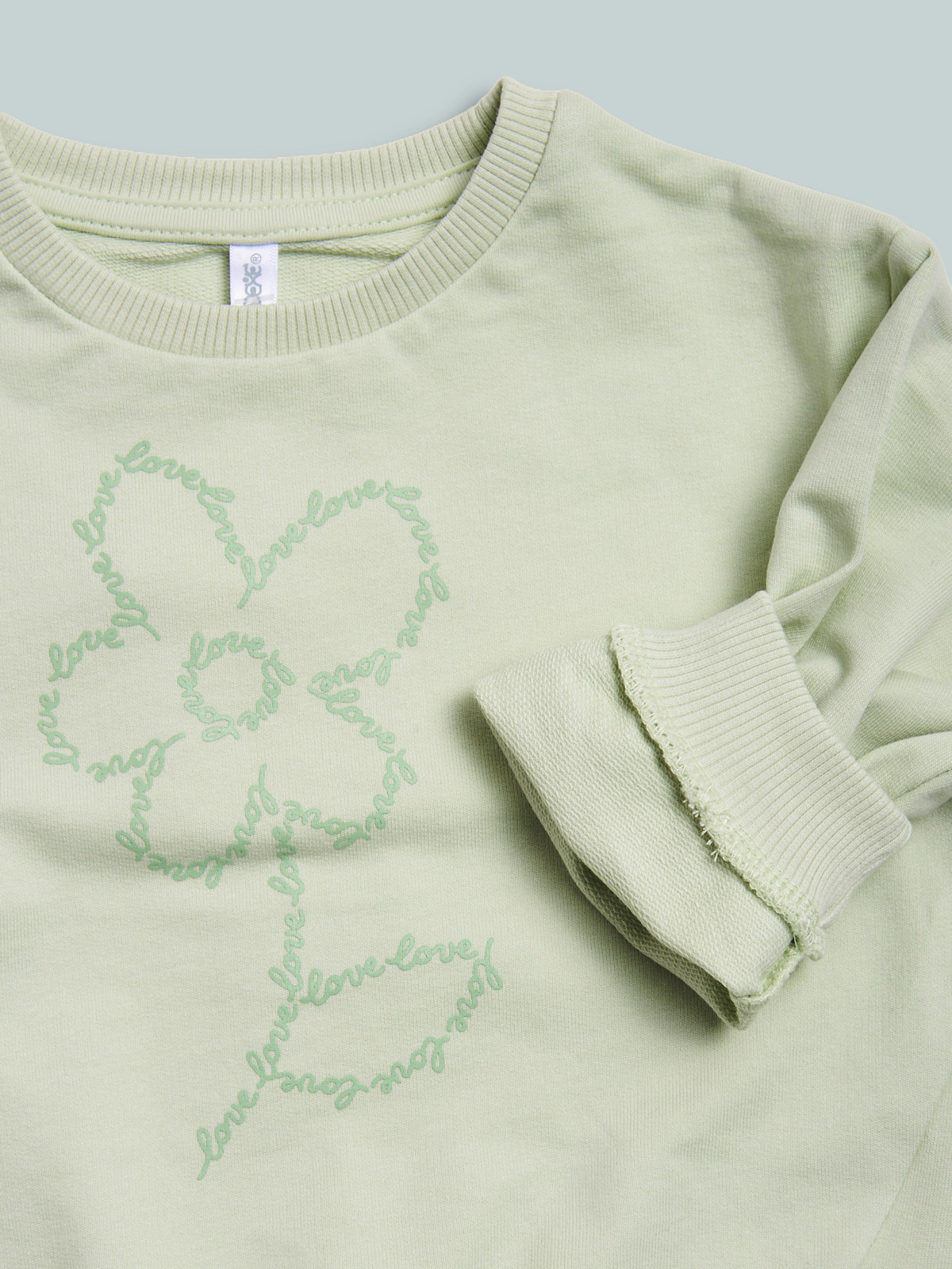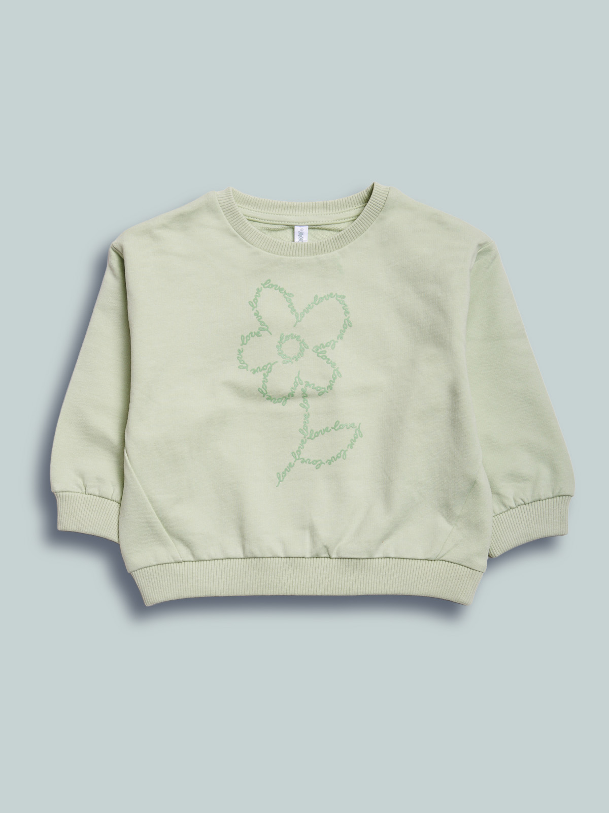 Maglia girocollo in morbida felpa leggera manica lunga. Collo, polsi e fondo in costina. Simpatica stampa fiore. Un capo versatile e di facile abbinamento.