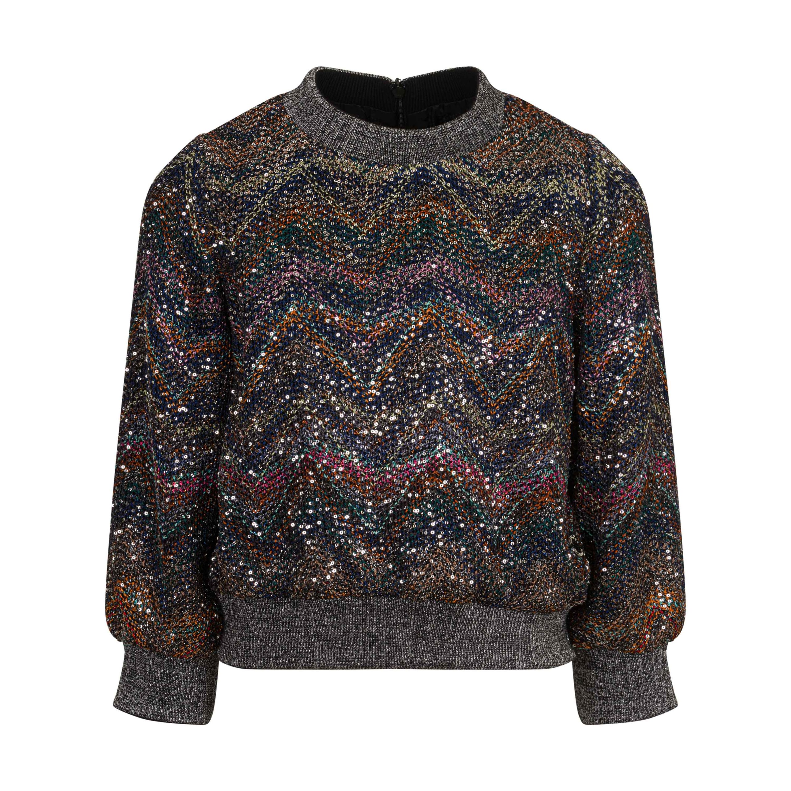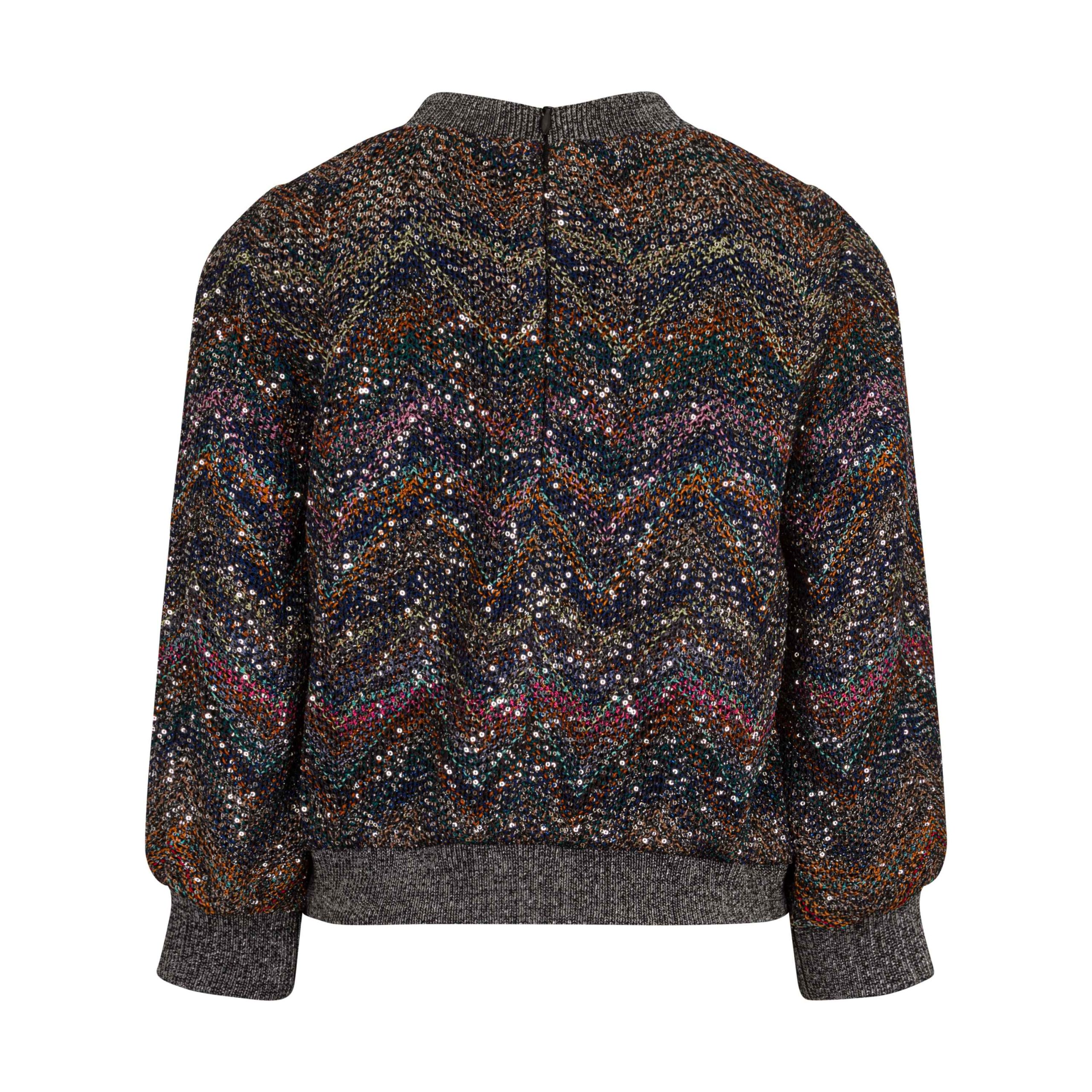 Maglia cropped per ragazze vestibilitร cropped con maniche leggermente piรน lunghe; scollo tondo fantasia multicolor con paillettes e chiusura posteriore con zip.