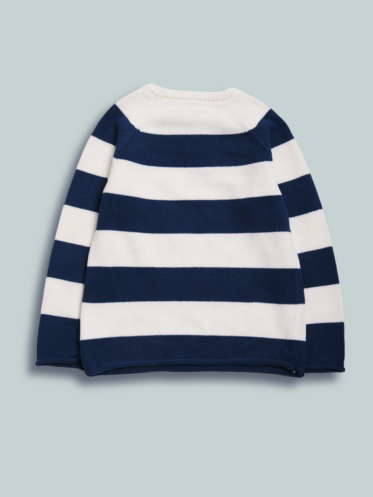 Maglioncino girocollo in morbido tricot rigato, etichetta sul fondo. Un capo “evergreen” facile da abbinare e che non puo’ mancare nell’armadio del vostro bambino.