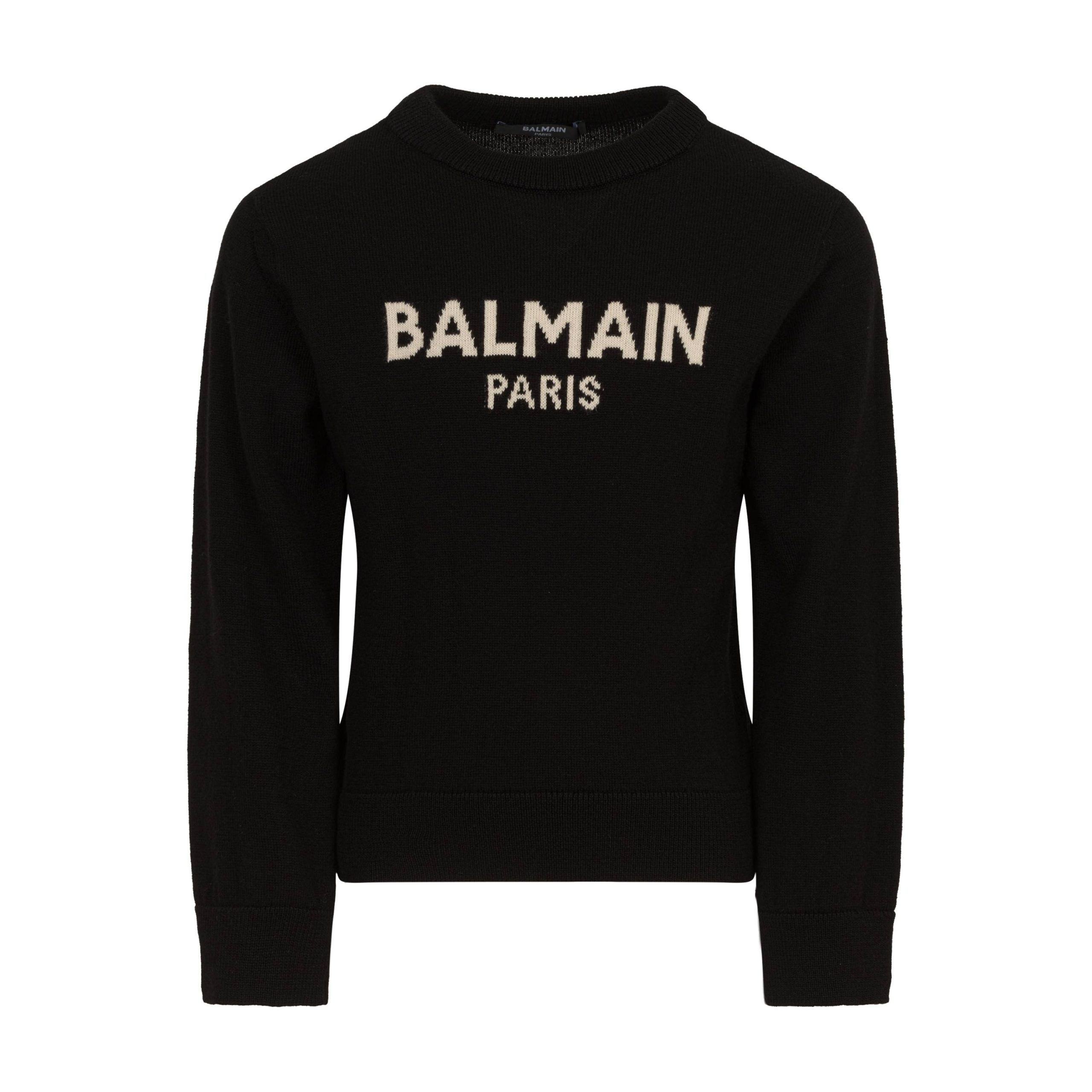 Maglione nero con girocollo, bordo a coste, vestibilitร comoda. Logo Balmain Paris intarsiato a contrasto. Composizione: Cotone 85% – Lana 15%.